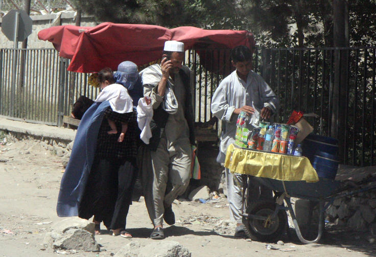 A man walking past a vendor in Kabul, 8 September 2008, with a burka-covered woman and a child.