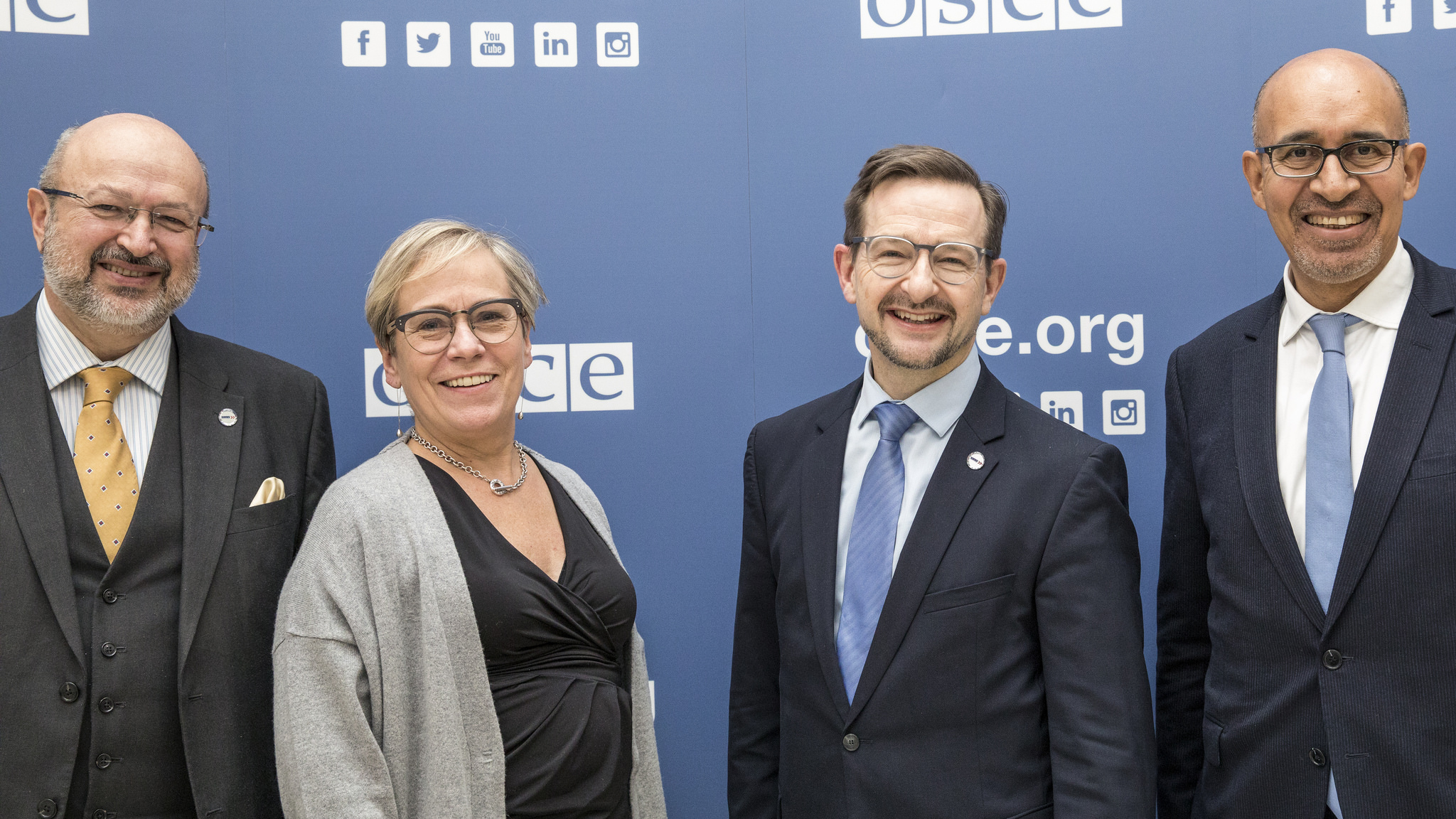 (l-r) OSCE High Commissioner on National Minorities, Lamberto Zannier, Director of the OSCE Office for Democratic Institutions and Human Rights, Ingibjörg Sólrún Gísladóttir, OSCE Secretary General, Thomas Greminger and OSCE Representative on Freedom of the Media, Harlem Désir meet together before the 24th OSCE Ministerial Council, Vienna, 6 December 2017.