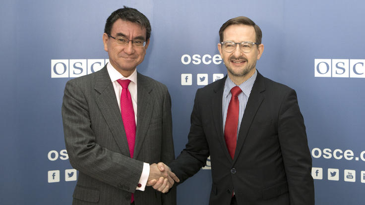 H.E. Tarō Kōno, Japan Minister of Foreign Affairs (l) with OSCE Secretary General Thomas Greminger, Vienna, 15 February 2018.