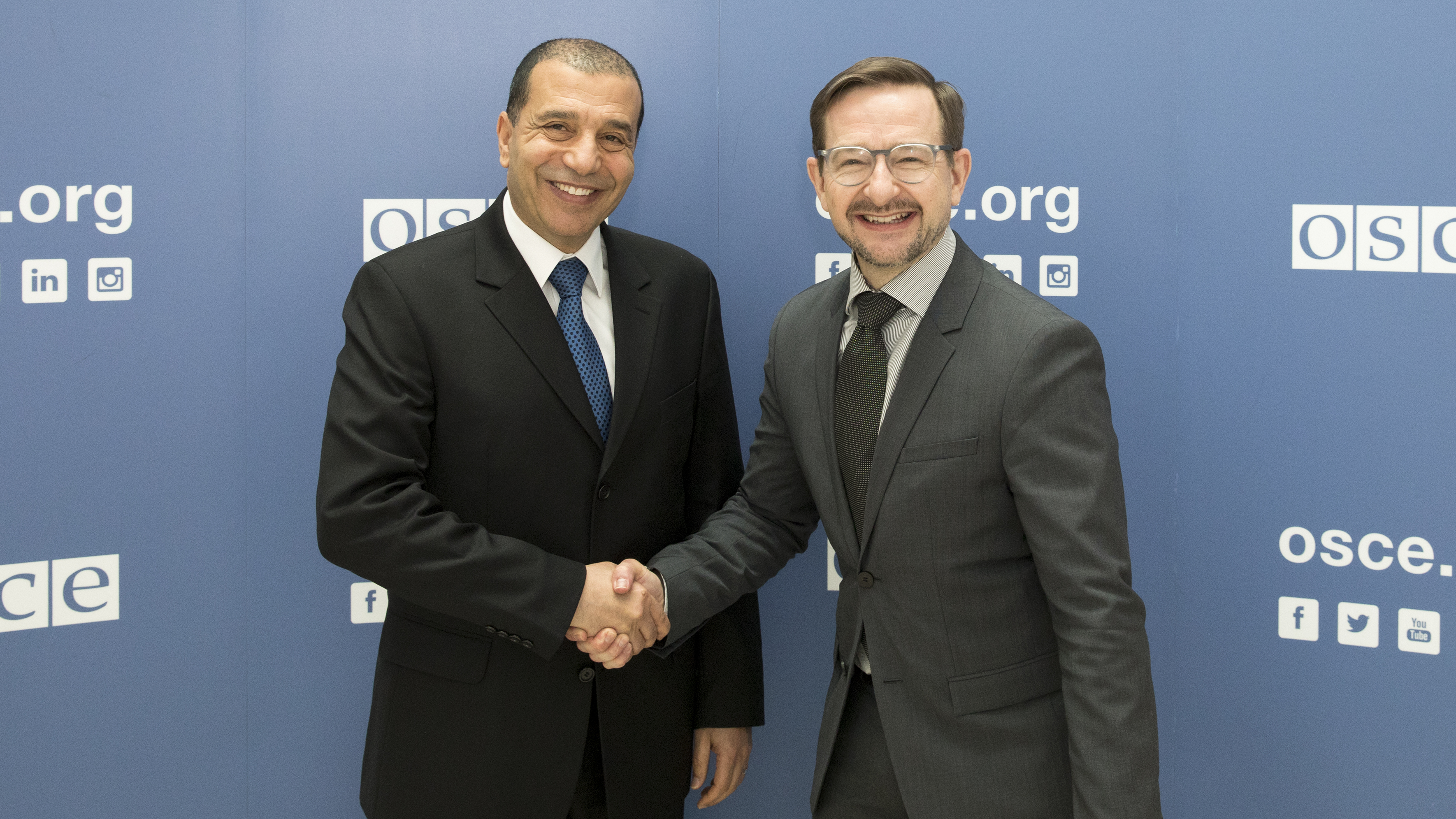 H.E. Mohamed Mezghani (l), Ambassador and Permanent Representative of the Republic of Tunisia, with OSCE Secretary General Thomas Greminger, Vienna, 10 April 2018.
