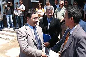 Head of Mission, Ambassador Maurizio Massari, and the OSCE South Serbia Co-ordinator, Martin Brooks, handing over books for the Albanian language high school library in Bujanovac