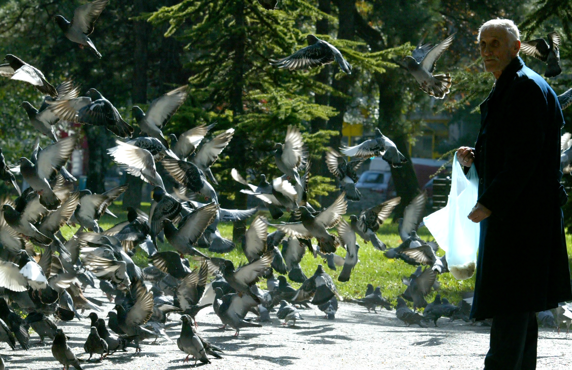 A man feeds pidgeons in Belgrade's Kalemegdan Fortress park, March 2007.