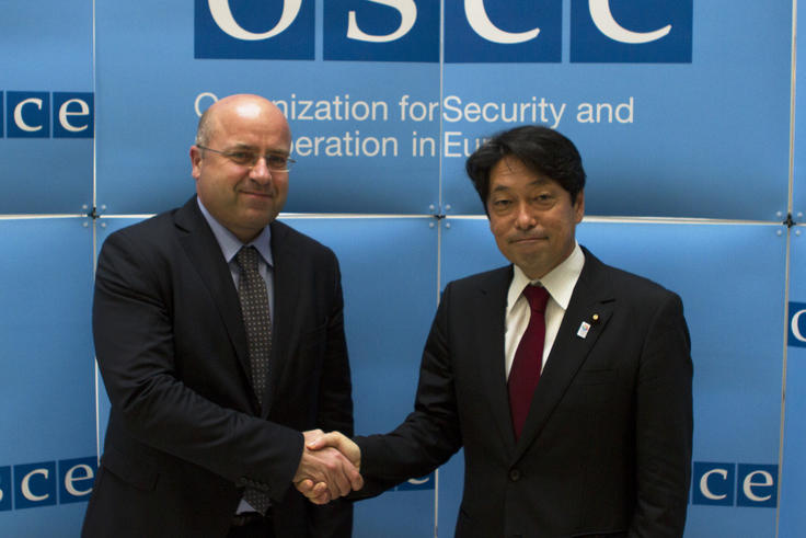 Japanese Defence Minister Itsunori Onodera (r) is greeted by the Director of the Office of the OSCE Secretary General Marcel Pesko, on an official visit to the OSCE Secretariat, Vienna, 30 July 2013.