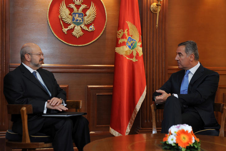 Prime Minister of Montenegro Milo Đukanović (r) in discussion with OSCE Secretary General Lamberto Zannier, Podgorica, 1 November 2013.