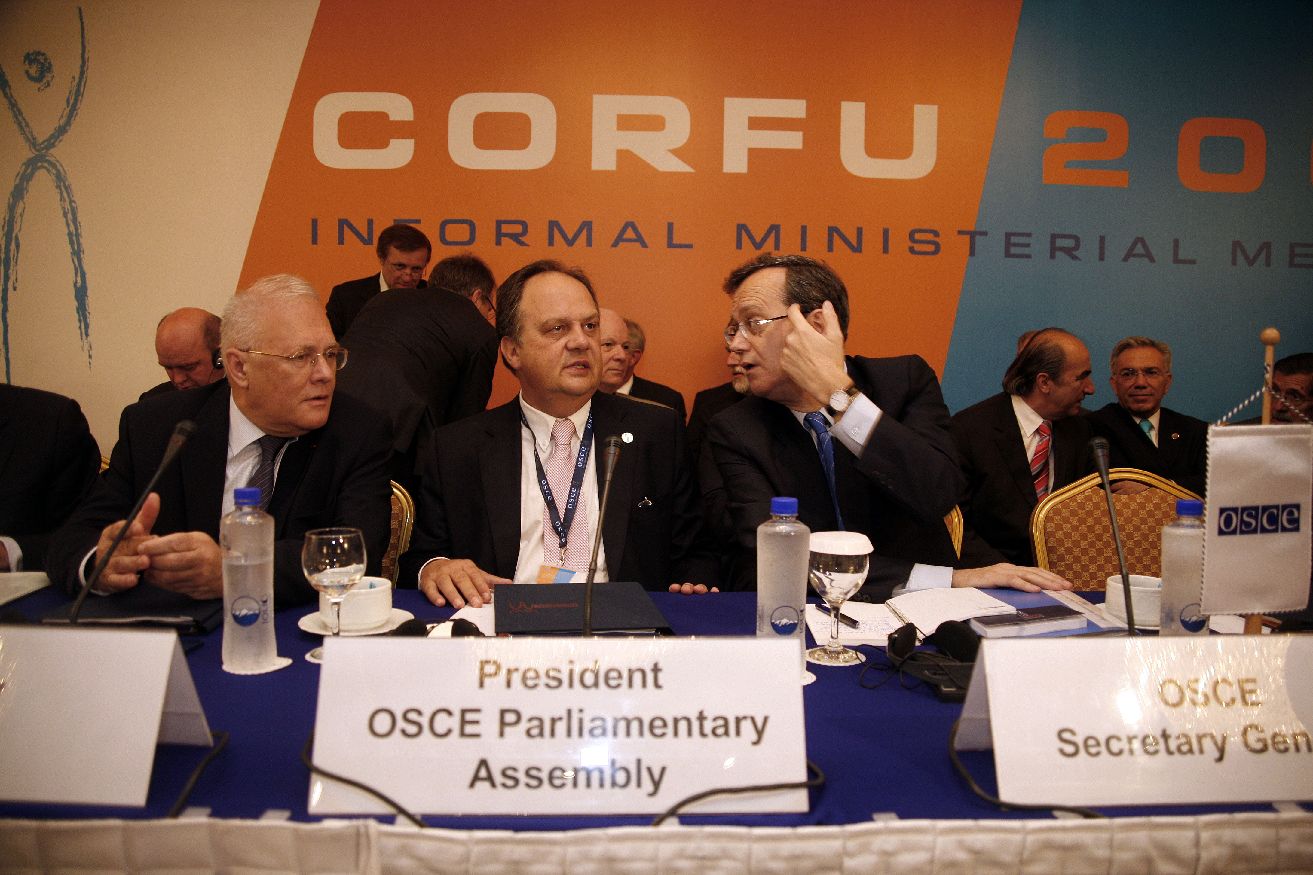 President of the OSCE Parliamentary Assembly, Joao Soares (l), with the OSCE's Secretary General Marc Perrin de Brichambaut, at the informal meeting of OSCE foreign ministers, Corfu, 28 June 2009.