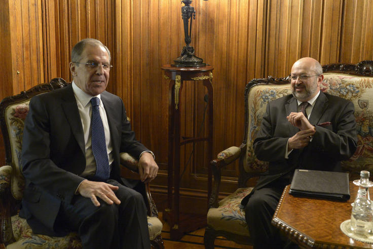 Russian Foreign Minister Sergey Lavrov (l) in discussion with OSCE Secretary General Lamberto Zannier, Moscow, 8 November 2013.