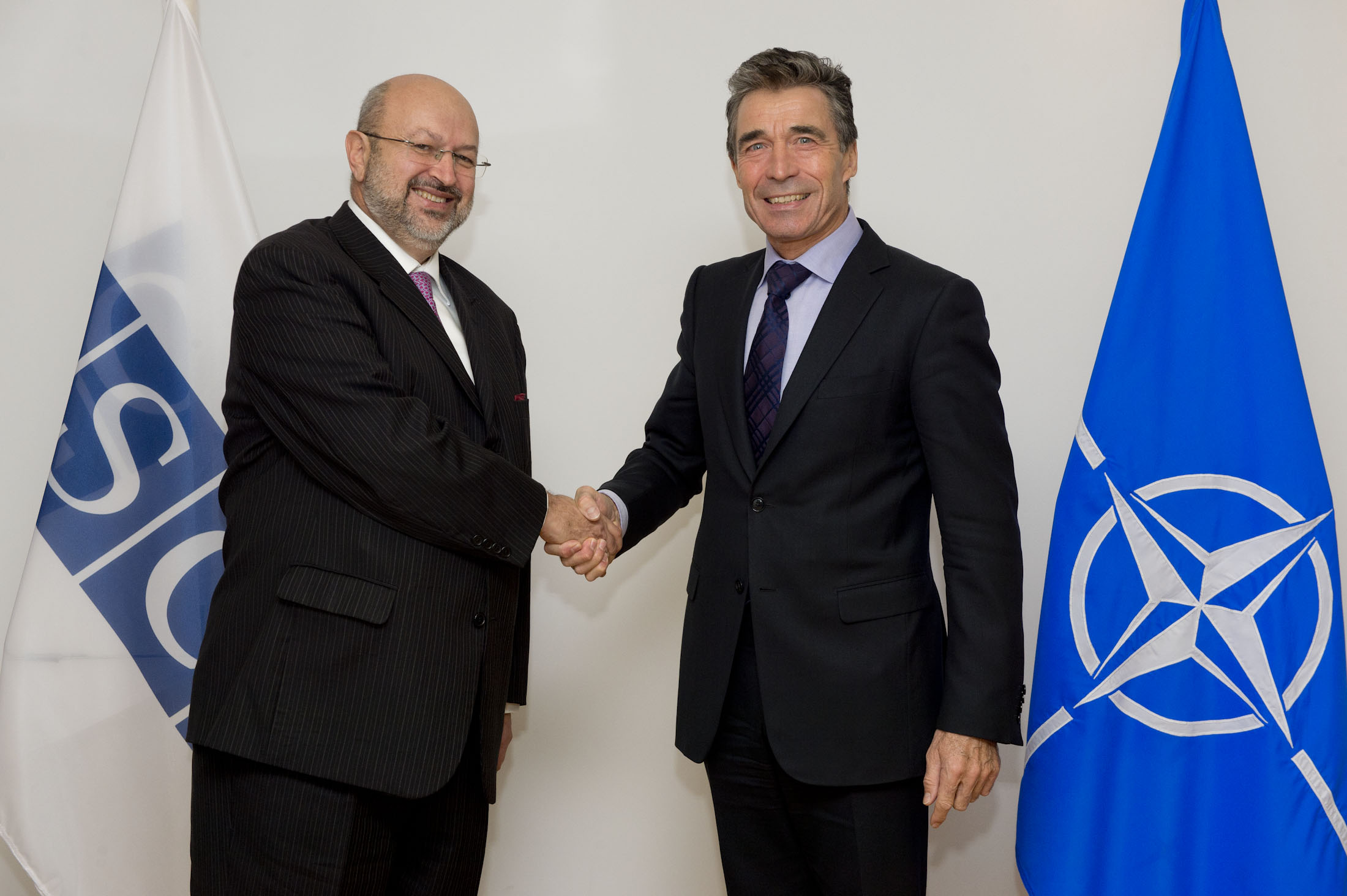 NATO Secretary General Anders Fogh Rasmussen (r) greets OSCE Secretary General Lamberto Zannier during an official visit to NATO Headquarters, Brussels, 25 November 2013.