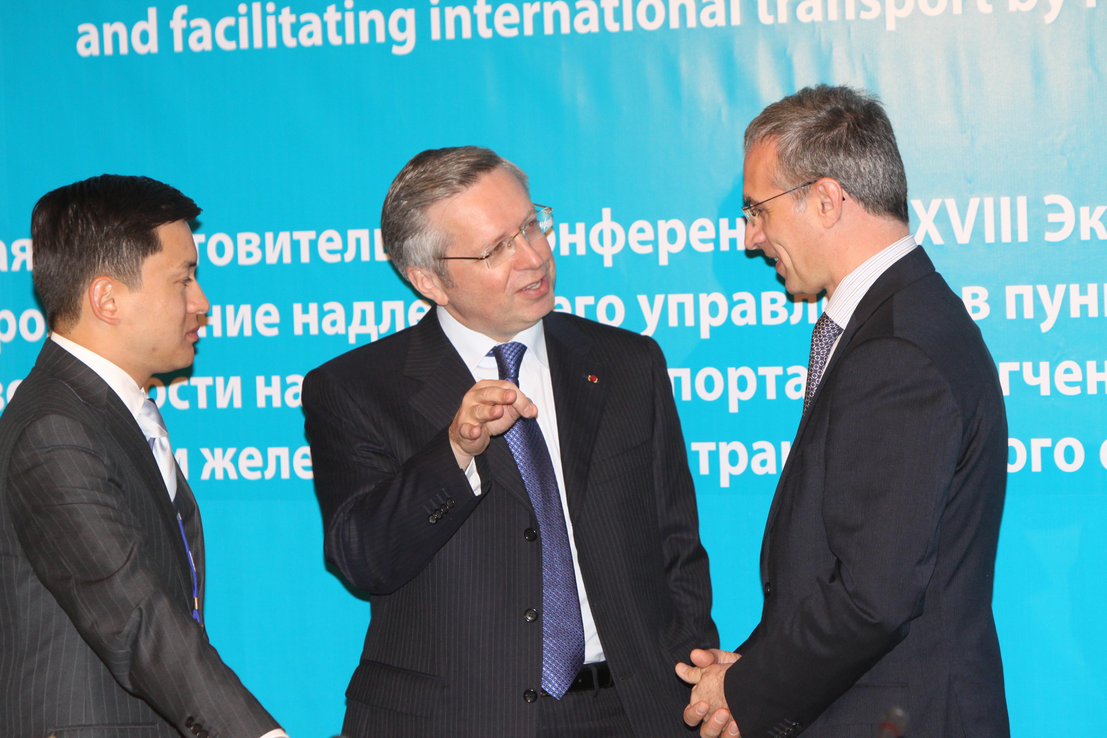 L-r: Deputy Minister of Transport of the Republic of Kazakhstan, Azat Bekturov; Deputy Minister of Foreign Affairs Konstantin Zhigalov; and Goran Svilanovic, Co-ordinator of OSCE Economic and Environmental Activities at Preparatory Conference in Astana.