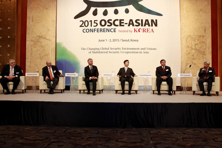 (L-r) Ambassador Vuk Žugić, OSCE Secretary General Lamberto Zannier, Swiss Foreign Minister Didier Burkhalter, Foreign Minister of the Republic of Korea Yun Byung-se, and the Deputy Prime Minister and Minister of Foreign Affairs of Thailand Tanasak Patimapragorn at the opening of the 2015 OSCE Asian Conference, Seoul, 1 June 2015.