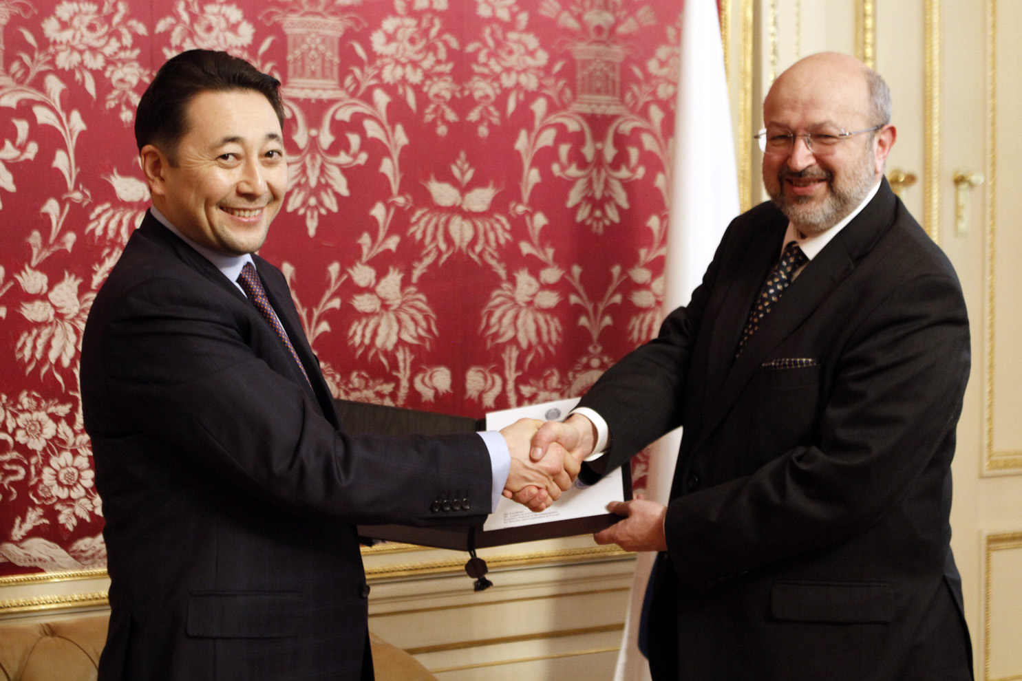 H.E. Ambassador Kairat Sarybay (l), Permanent Mission of the Republic of Kazakhstan to the International Organizations in Vienna, and the OSCE Secretary General Lamberto Zannier, Vienna, 19 February 2014.