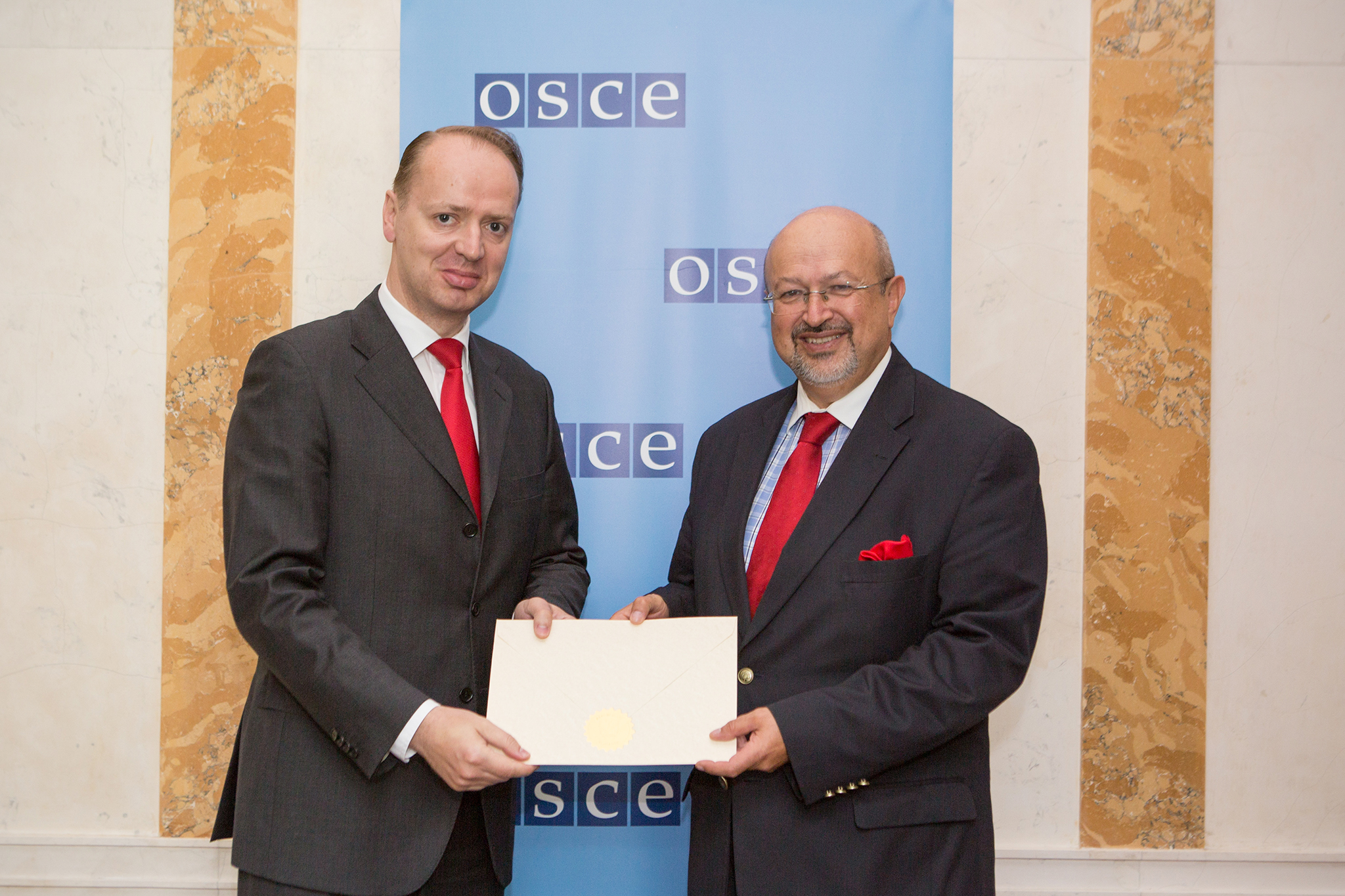 H.E. Ambassador Andrej Benedejčič (l), Permanent Representation of the Republic of Slovenia to the UN, OSCE and other International Organisations in Vienna , and the OSCE Secretary General Lamberto Zannier, Vienna, 24 August 2015.