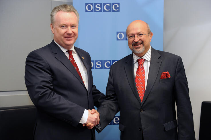 H. E. Ambassador Alexander Lukashevich (l), Permanent Mission of the Russian Federation to the OSCE in Vienna, and the OSCE Secretary General Lamberto Zannier, Vienna, 3 September 2015.