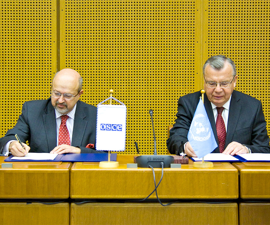 (l-r) OSCE Secretary General, Lamberto Zannier and UNODC Executive Director, Yury Fedotov sign new Joint Plan of Action with combatting smuggling of migrants and terrorism prevention high on the agenda, Vienna, 9 March 2016.