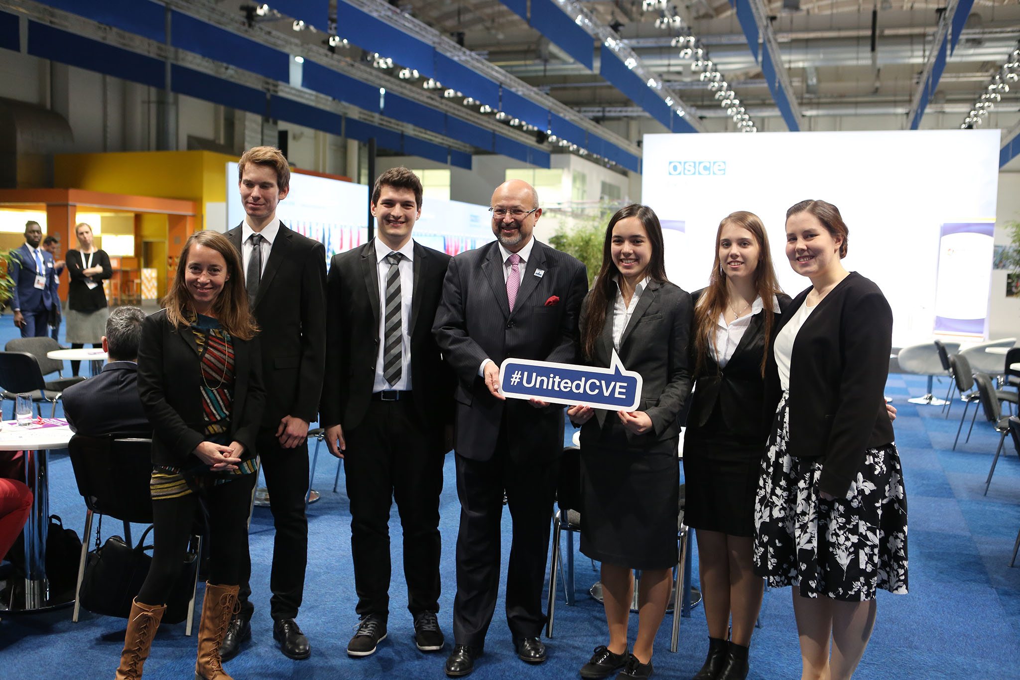 Secretary General Lamberto Zannier (c) with the team from Ljubljana University, Slovenia, one of the three finalists of the #UnitedCVE Peer-2-Peer OSCE Regional Competition on challenging violent extremism in Hamburg, 7 December 2016.