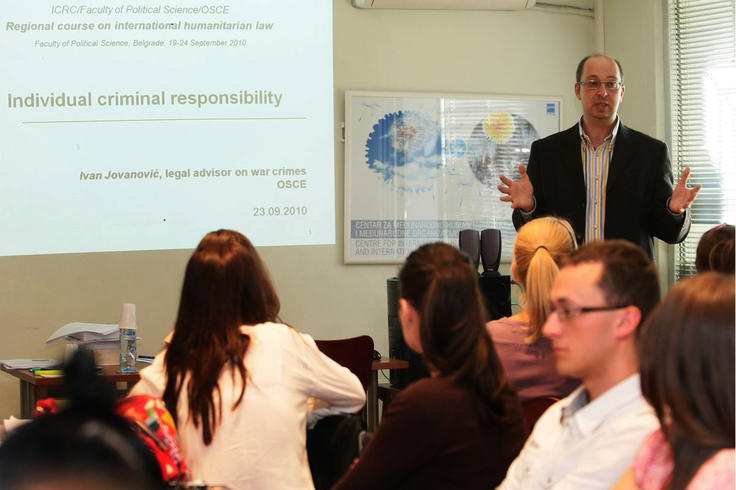 Ivan Jovanovic, legal adviser on war crimes at the OSCE, gives a seminar in International Humanitarian Law at the Faculty of Political Science, Belgrade, 23 September 2010.