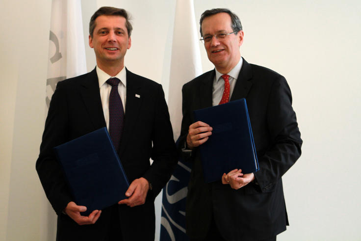 Marc Perrin de Brichambaut, OSCE Secretary General (right), and Martin Kreutner, Chair of the International Anti-Corruption Academy (IACA) International Transition Team, after signing a Memorandum of Understanding between the organizations, Vienna, 28 March 2011.
