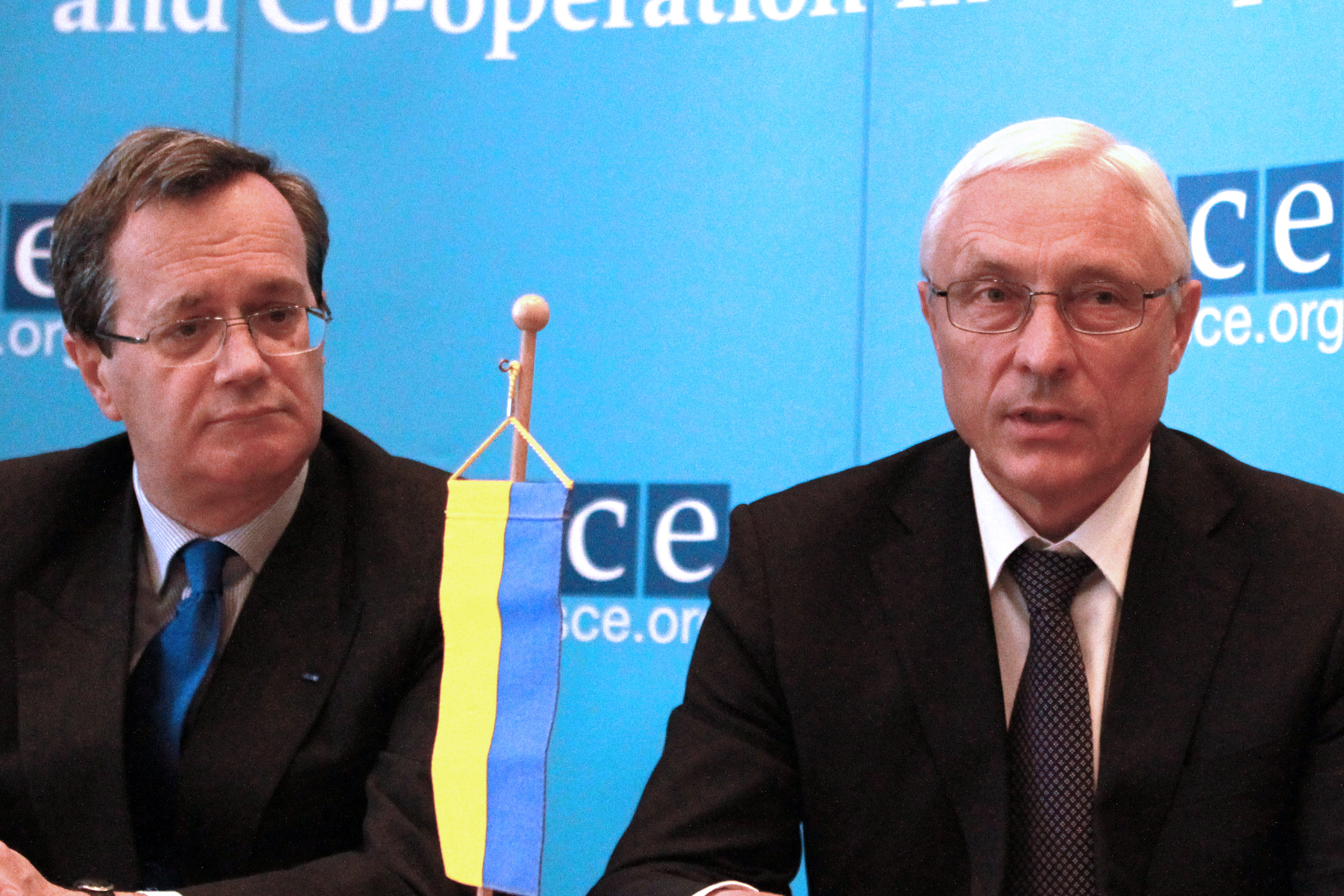 OSCE Secretary General Marc Perrin de Brichambaut and Ukrainian Deputy Defence Minister Volodymyr Omelianchuk at a ceremony to sign a contract extension for the safe disposal of 9,500 tonnes of a toxic rocket fuel component stored in Ukraine. Vienna, 15 June 2011.