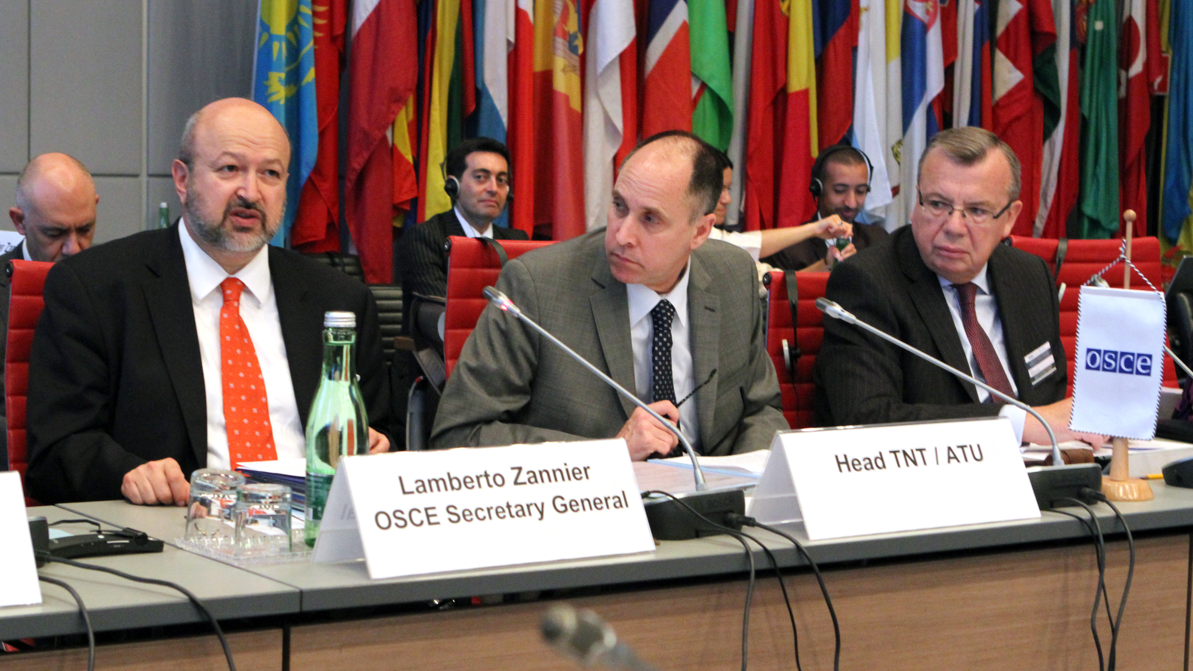 L-r: OSCE Secretary General Lamberto Zannier; Thomas Wuchte, Head on OSCE Anti-Terrorism Issues; and Yuri Fedotov, Executive Director of the United Nations Office on Drugs and Crime, during a conference on improving the control of explosive substances, Vienna, 10 May 2012.