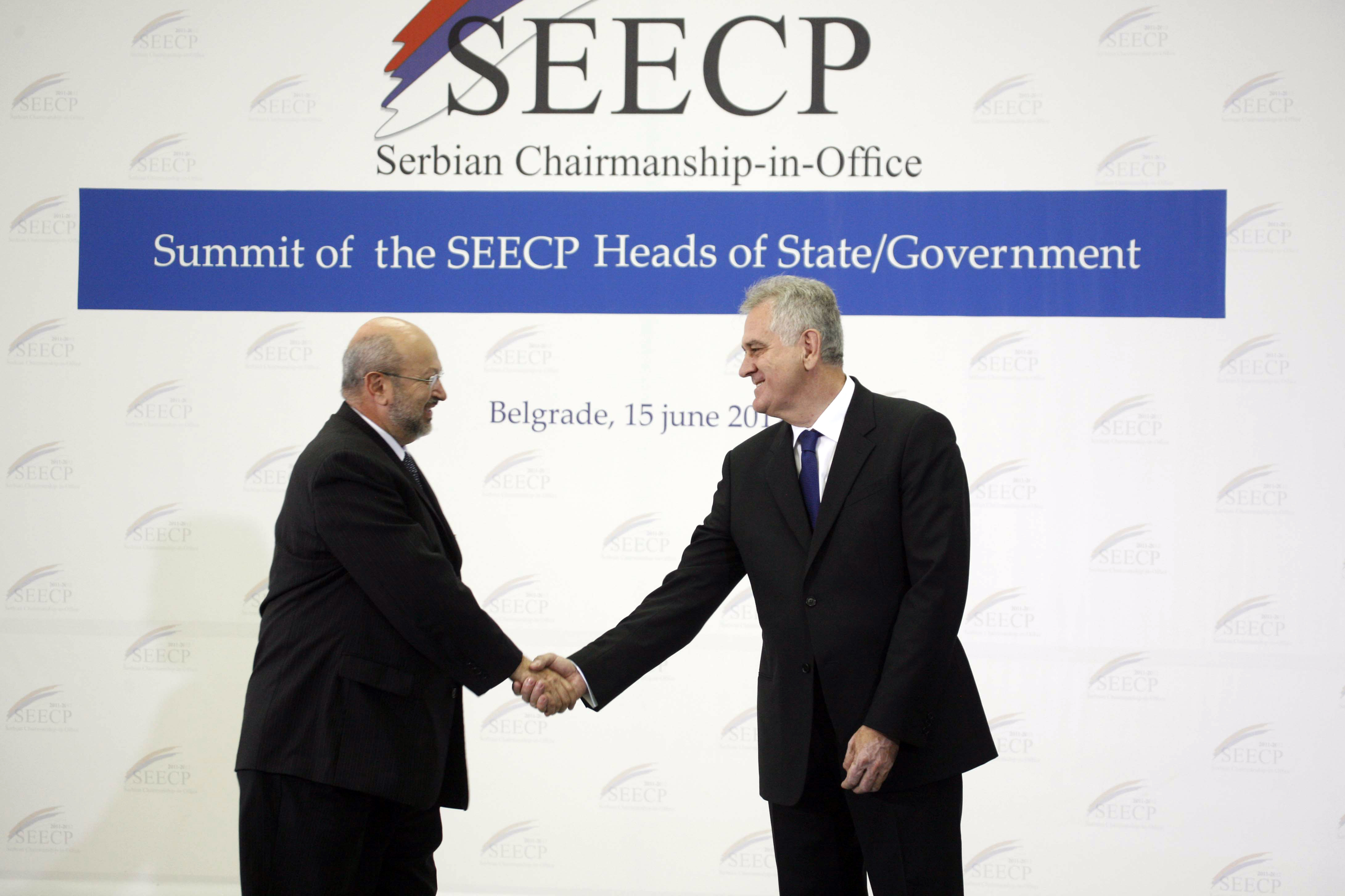 The OSCE Secretary General, Lamberto Zannier (left), and President Tomislav Nikolic at the South-East Europe Co-operation Process (SEECP) Summit in Belgrade,15 June 2012.