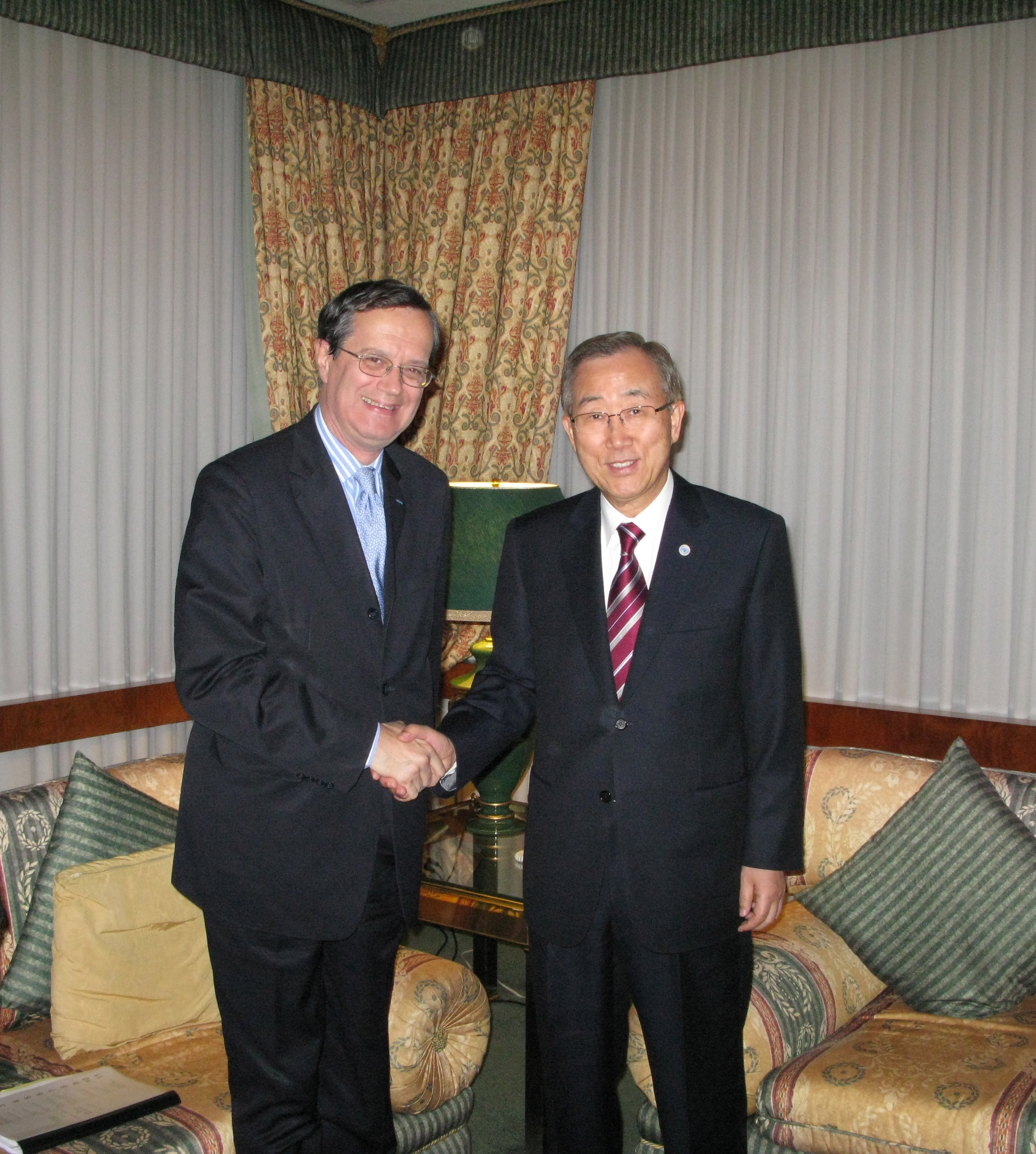 United Nations Secretary General Ban Ki-moon (right) with OSCE Secretary General Marc Perrin de Brichambaut, in Geneva 14 October 2008.