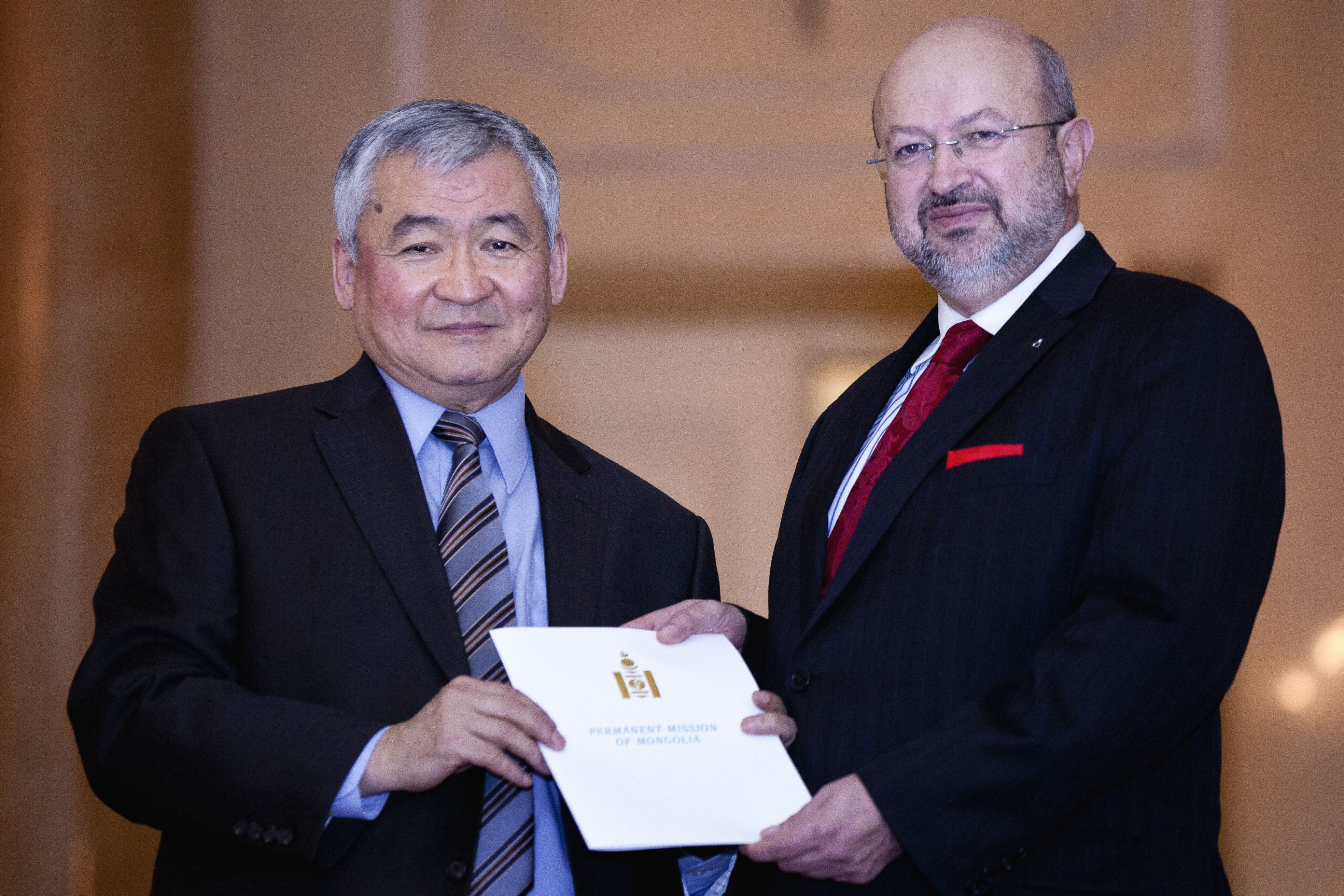 Ambassador Enkhsaikhan Jargalsaikhan (l), the Permanent Representative of Mongolia to the OSCE, hands over his credentials to OSCE Secretary General Lamberto Zannier at the Hofburg in Vienna, 22 November 2012. Mongolia officially became the Organization's 57th participating State on 21 November 2012.