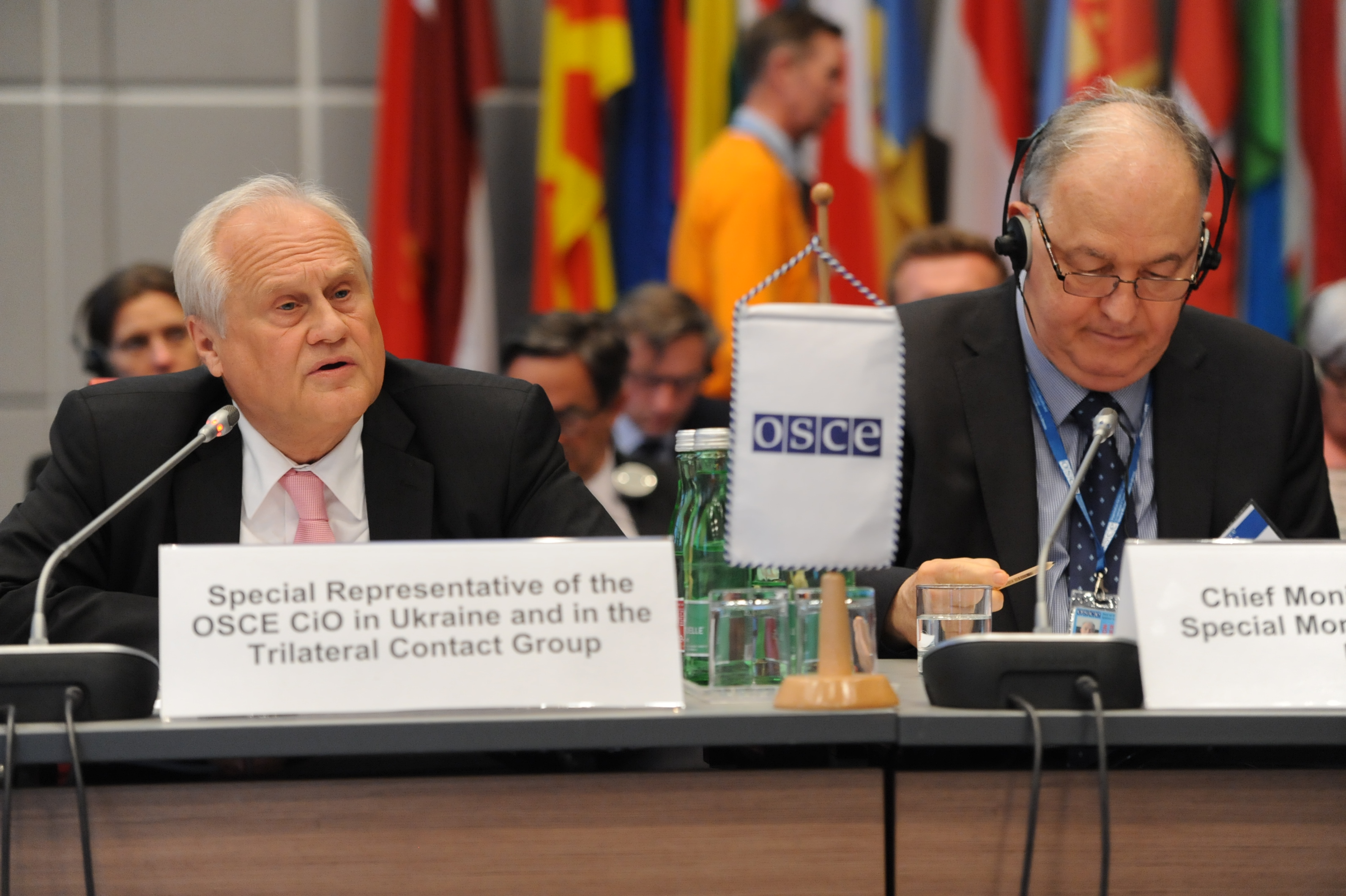 (l-r) Ambassador Martin Sajdik, the Special Representative of the OSCE Chairperson-in-Office in Ukraine and in the Trilateral Contact Group, and Ambassador Ertugrul Apakan, Chief Monitor of the OSCE Special Monitoring Mission to Ukraine addressing to the OSCE Permanent Council in Vienna, 5 April 2017.
