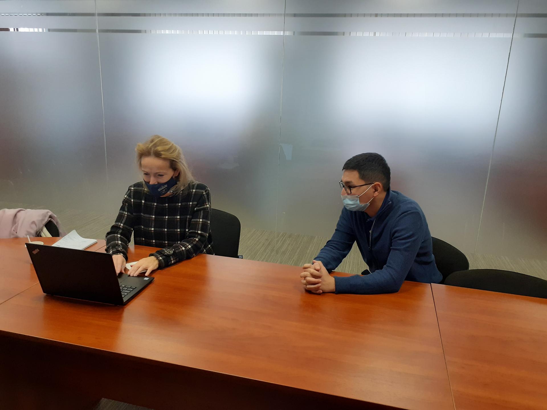 Arslan and Liliya set up the conference room in accordance with the Mission’s COVID-19 safety regulations.
