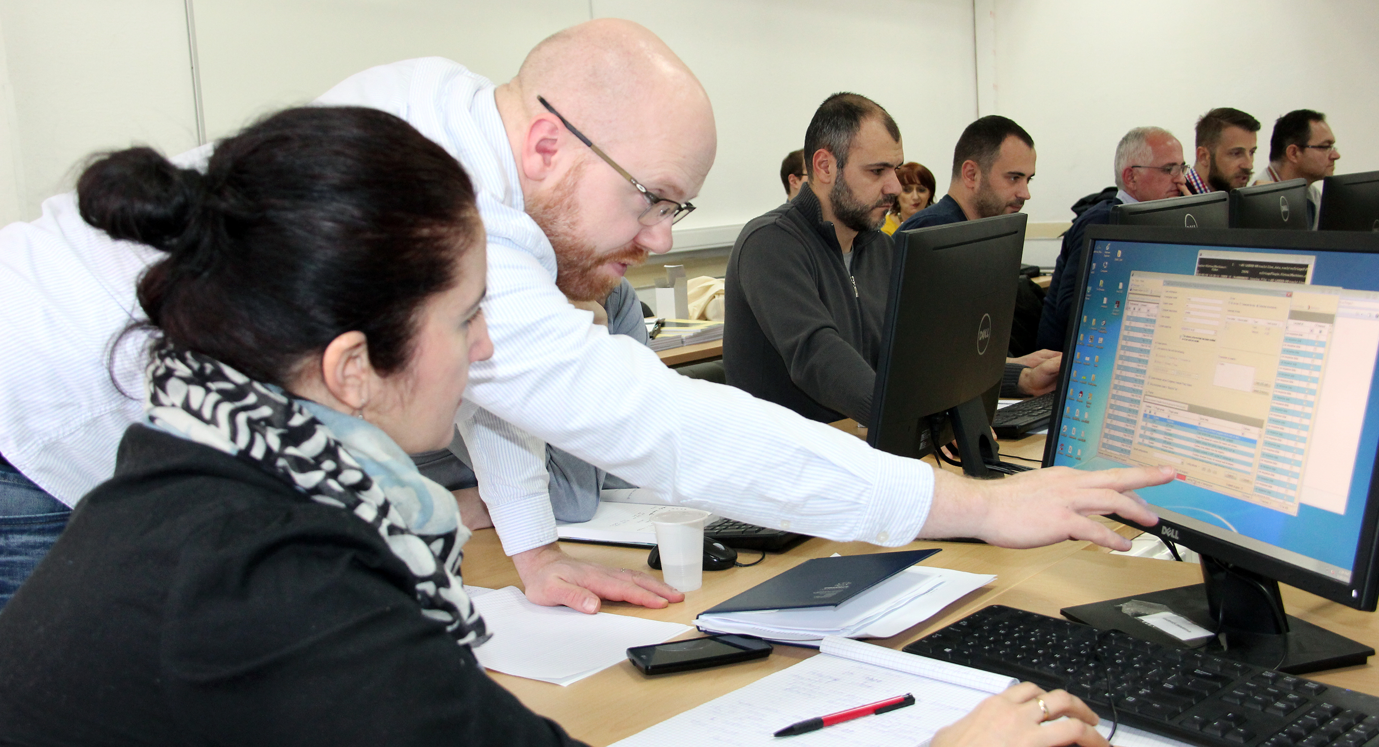 Një instruktor nga Shërbimi Policor i Norvegjisë, Ivar Friheim, duke ndihmuar pjesëmarrësit gjatë një ushtrimi praktik, Tiranë, më 28 shkurt 2018.