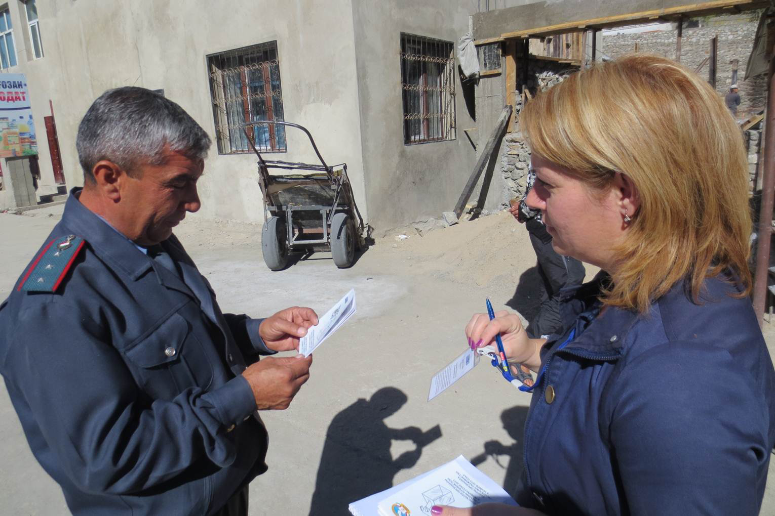 Outside the Khorogh central market, voter educator Salima Ismailova (r) showing her credentials distributes materials produced jointly by the OSCE and Tajkistan’s Central Commission on Elections and Referenda. A badge and a letter from the Central Commission served as confirmation of authorization for the public information campaign.