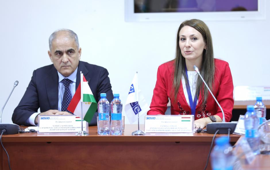 (аз чап ба рост) Ҷамшед Ҳомидзода, Сардори Раёсати созмонҳои байналмилалии Вазорати корҳои хориҷии Ҷумҳурии Тоҷикистон, ва Татяна Туркан, Иҷрокунандаи вазифаи Роҳбари Дафтари барномаҳои САҲА дар Душанбе, зимни суханронии ифтитоҳӣ дар Ҷаласаи ҳафтуми Платформаи ҳамкорӣ дар Душанбе, 2 октябри соли 2025.