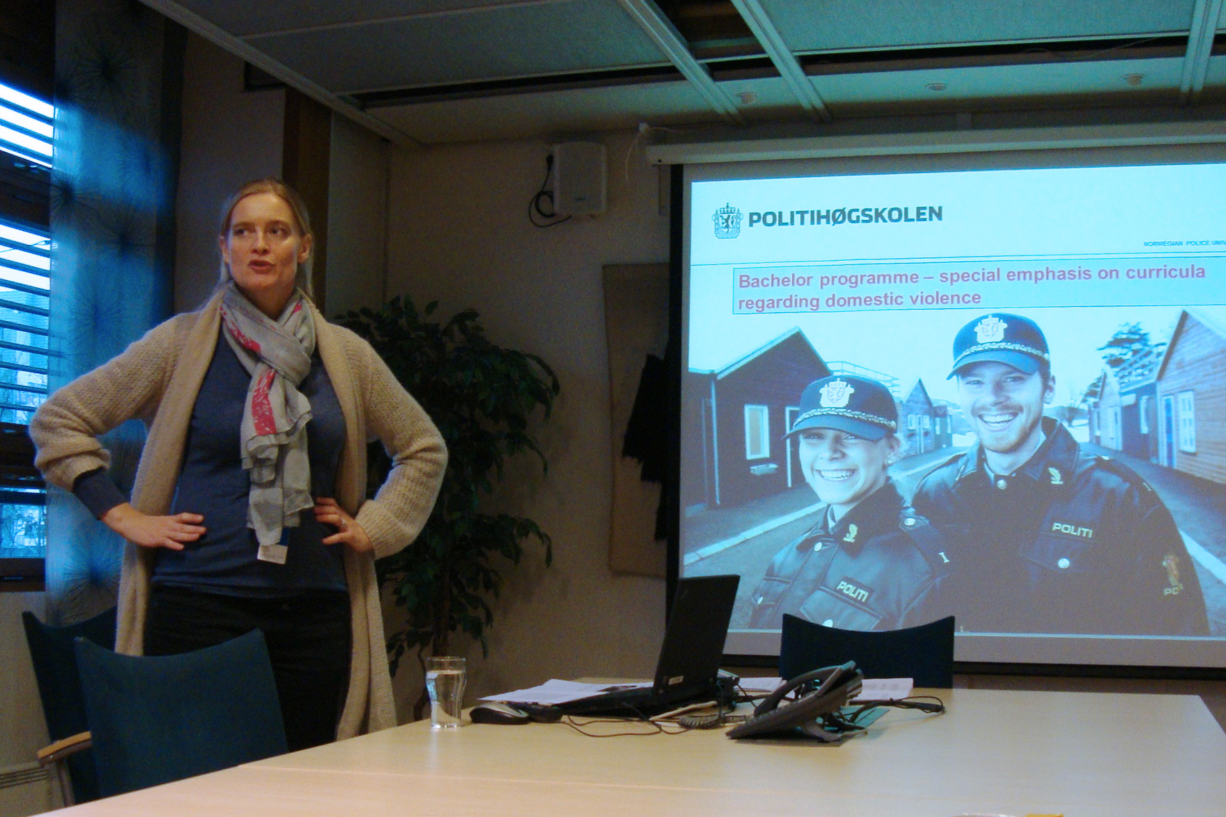 Кірсті Хелене Мессел, старший радник міжнародного відділу Університетського колледжу норвезької поліції, пояснює українським експертам, як тему боротьби з домашнім насильством викладають правоохоронцям в Норвегії.