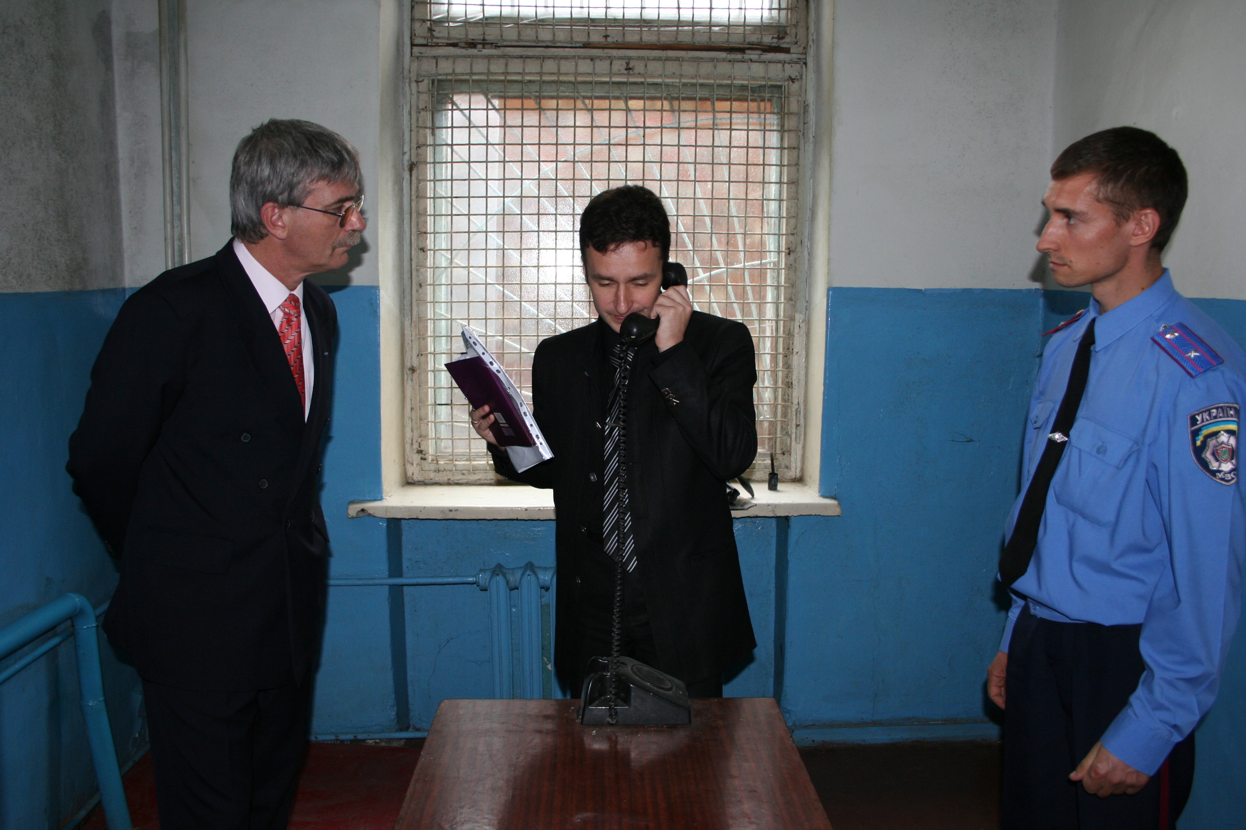 Любомир Копай, Координатор проектів ОБСЄ в Україні, та Юрій Чумак, помічник міністра внутрішніх справ України із дотримання прав людини у Харківській області, знайомляться з роботою телефонної «гарячої лінії» під час візиту до ізолятора тимчасового тримання в рамках проекту ОБСЄ, спрямованого на попередження тортур та інших форм нелюдського поводження в місцях позбавлення волі, 4 вересня 2009 р.