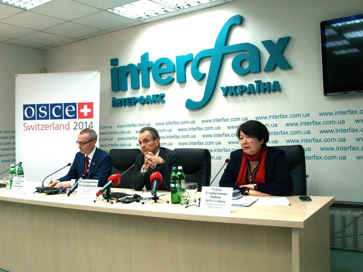 Ambassador of Switzerland to Ukraine Christian Schoenenberger, Personal Envoy of CiO on Ukraine Tim Guldimann, OSCE Project Co-ordinator in Ukraine Madina Jarbussynova announce launch of National Dialogue Project at a press-conference in Kyiv, Ukraine, 20 March 2014