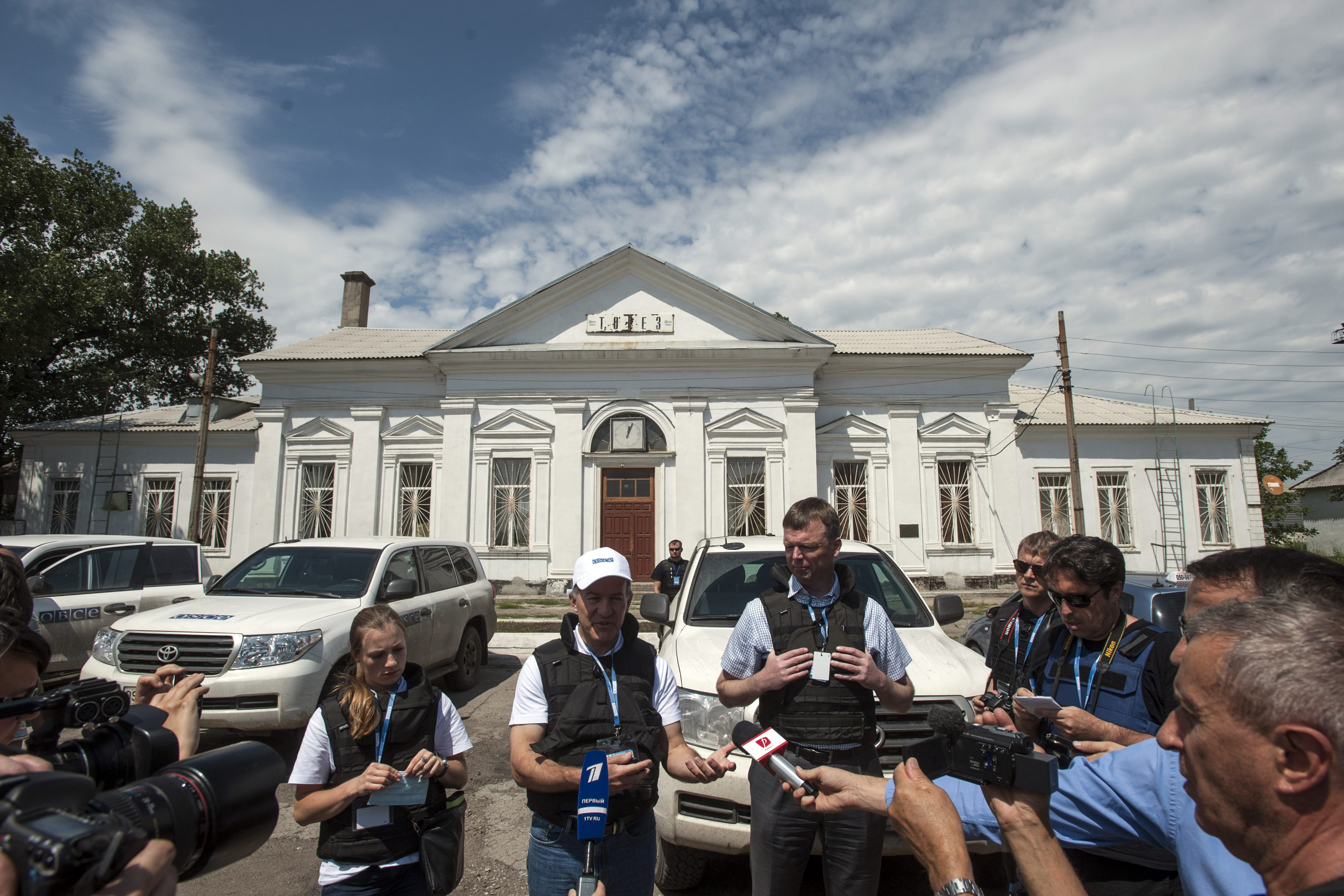 Члени спеціальної моніторингової місії ОБСЄ в Україні проводять прес-брифінг біля залізничного вокзалу в Торезі, де в спеціальних вагонах зберігається багато тіл з місця аварії.