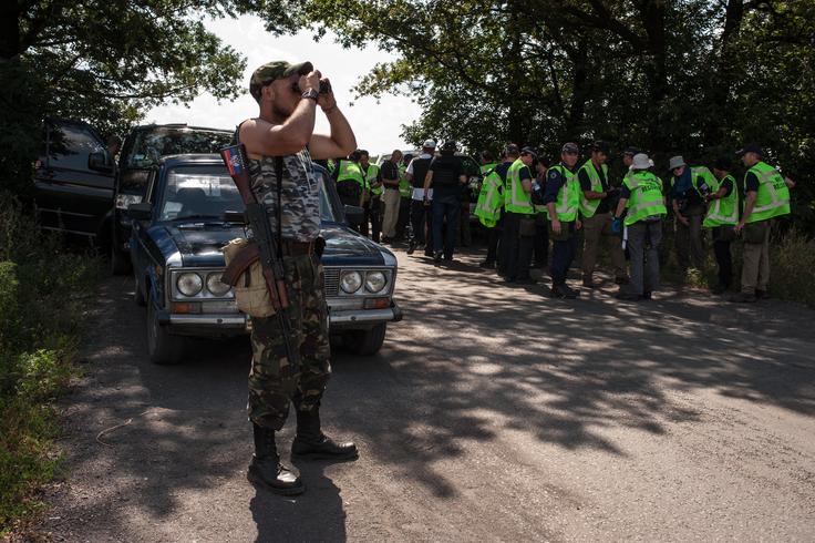 Озброєний чоловік дивиться в бінокль, поки міжнародні експерти збираються біля місця падіння МН17, 5 серпня 2014 року.