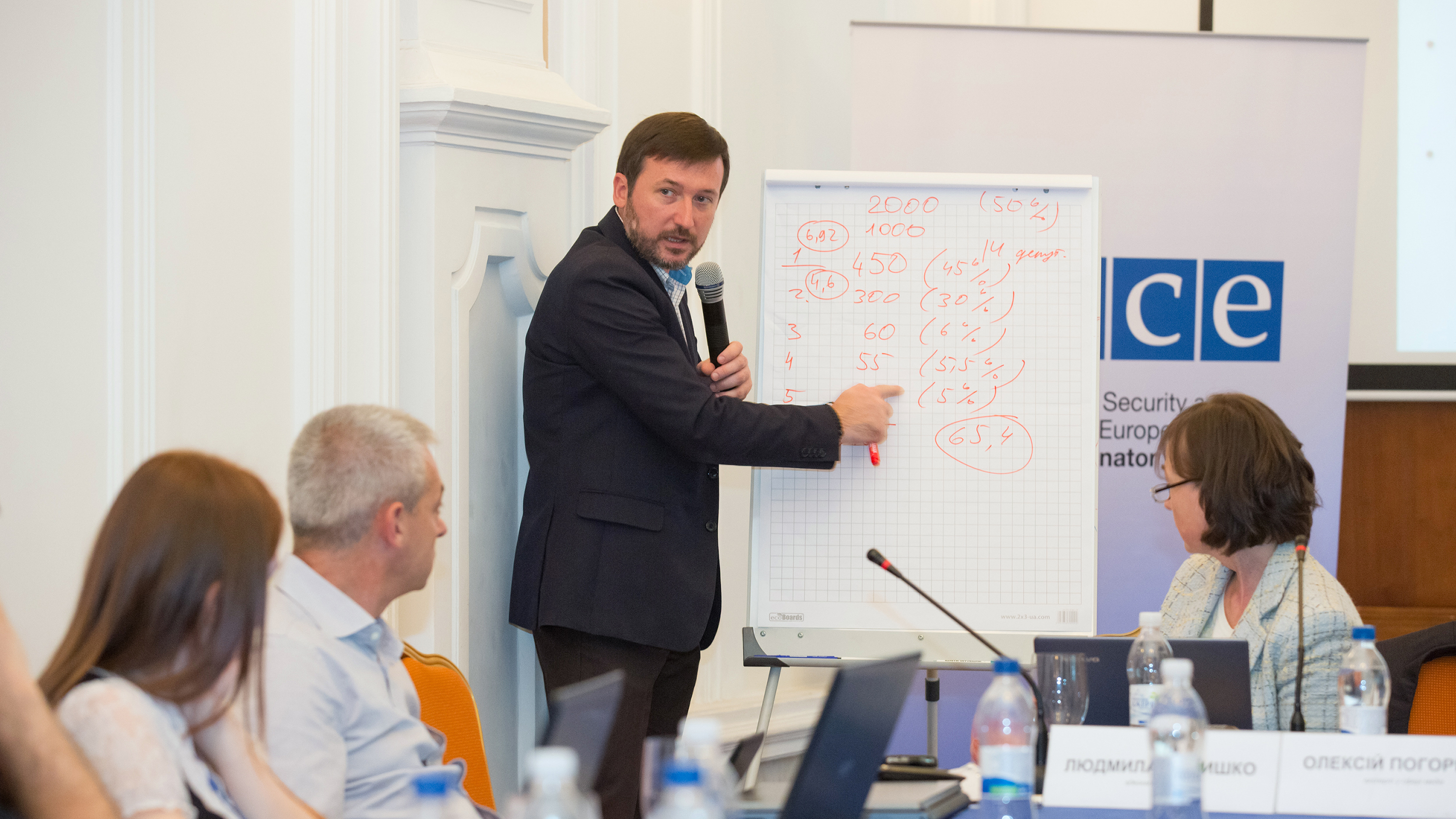Сергій Ткаченко, експерт з виборчих питань, роз’яснює журналістам як за нових законів розподіл голосів виборців визначатиме переможців, Одеса, 28 вересня 2015 р.