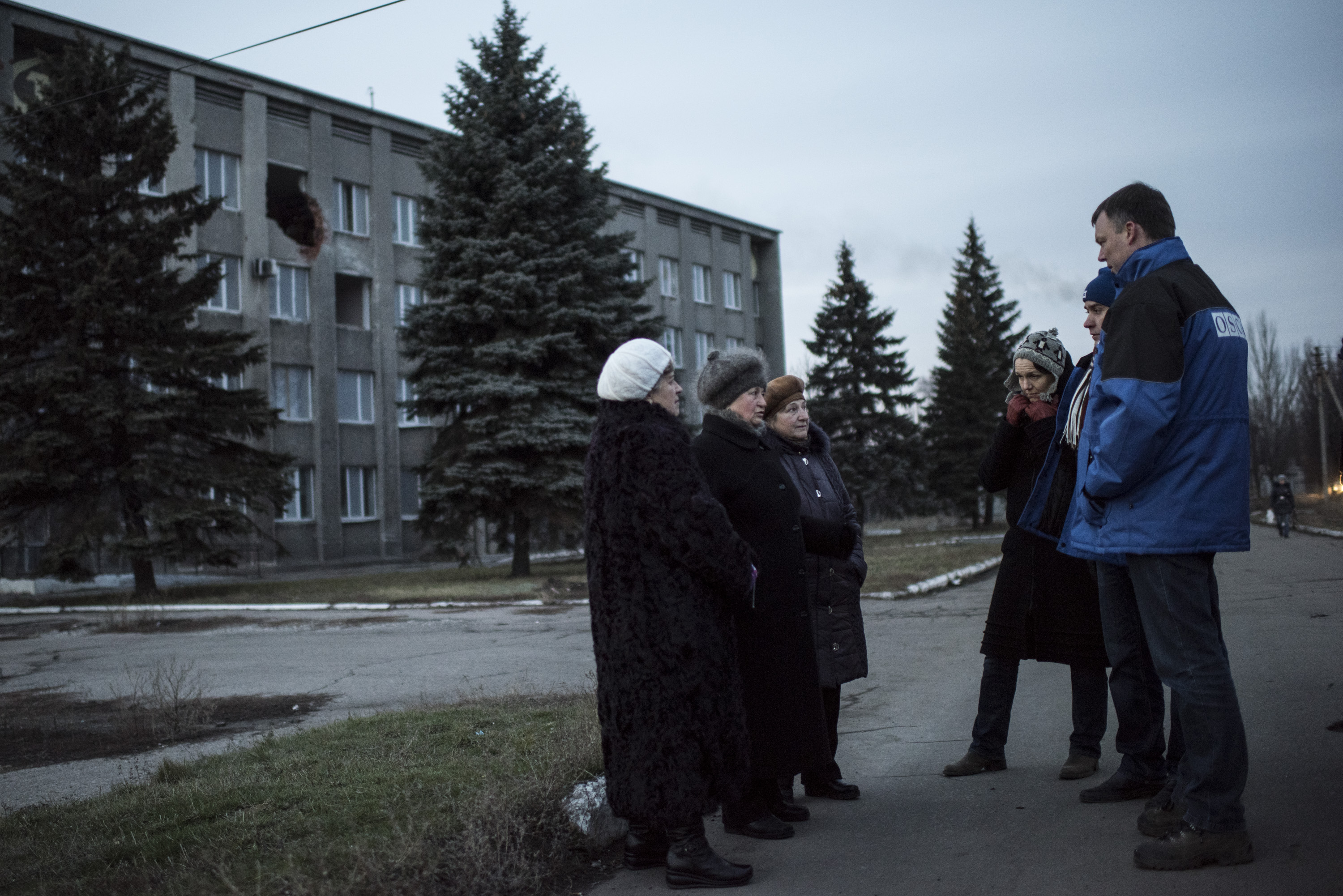 Спостерігачі СММ ОБСЄ спілкуються з місцевими жителями у Дебальцевому біля колишнього штабу Спільного центру з контролю і координації в місті, 10 грудня 2015 року.
