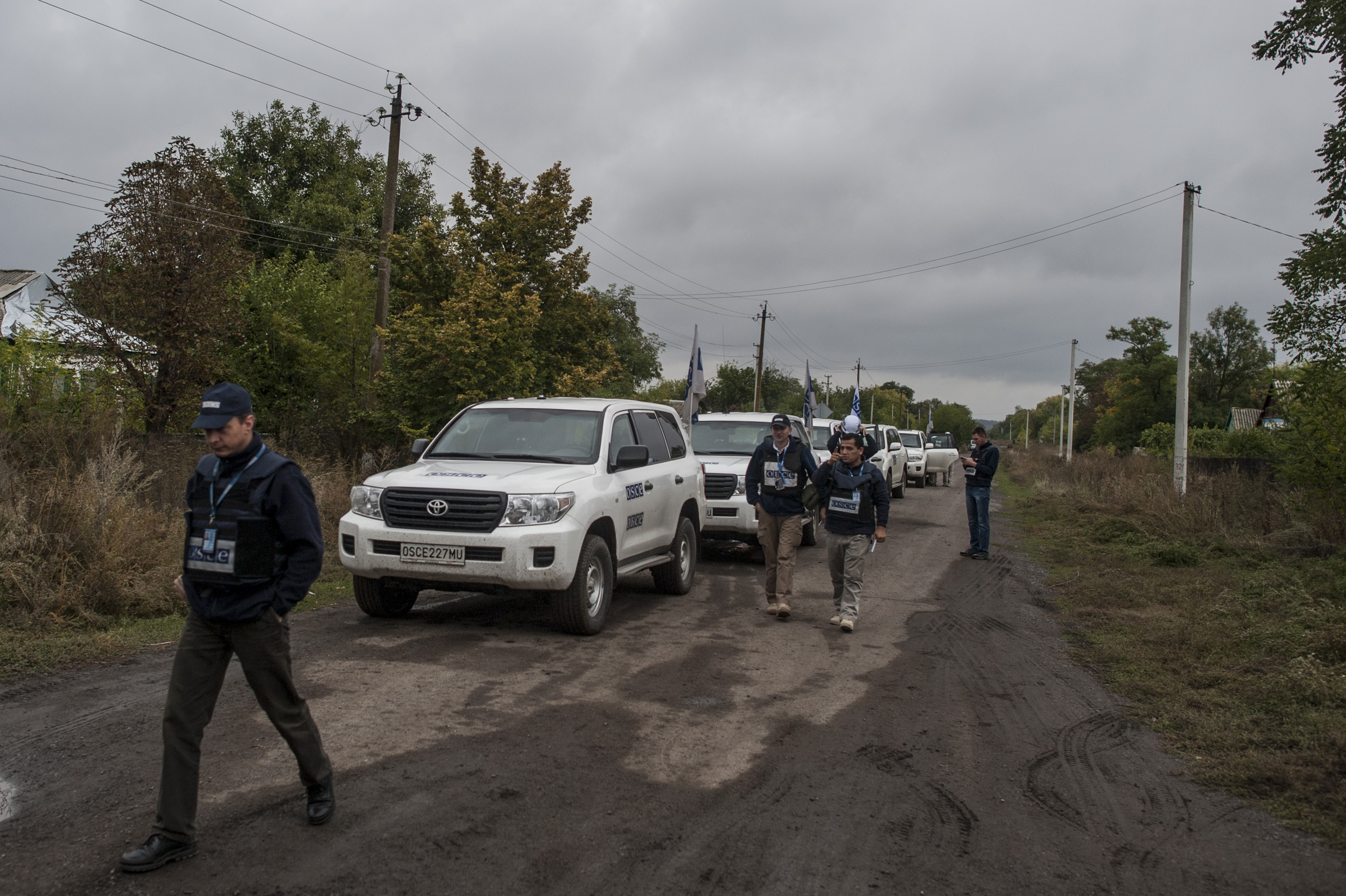 Спостерігачі СММ здійснюють патрулювання у Петрівському, Донецька область, вересень 2016 року. У рамках свого мандата СММ спостерігатиме за процесом розведення сил і засобів і виконанням сторонами взятих на себе зобов’язань у районах населених пунктів Петрівське, Золоте і Станиця Луганська.