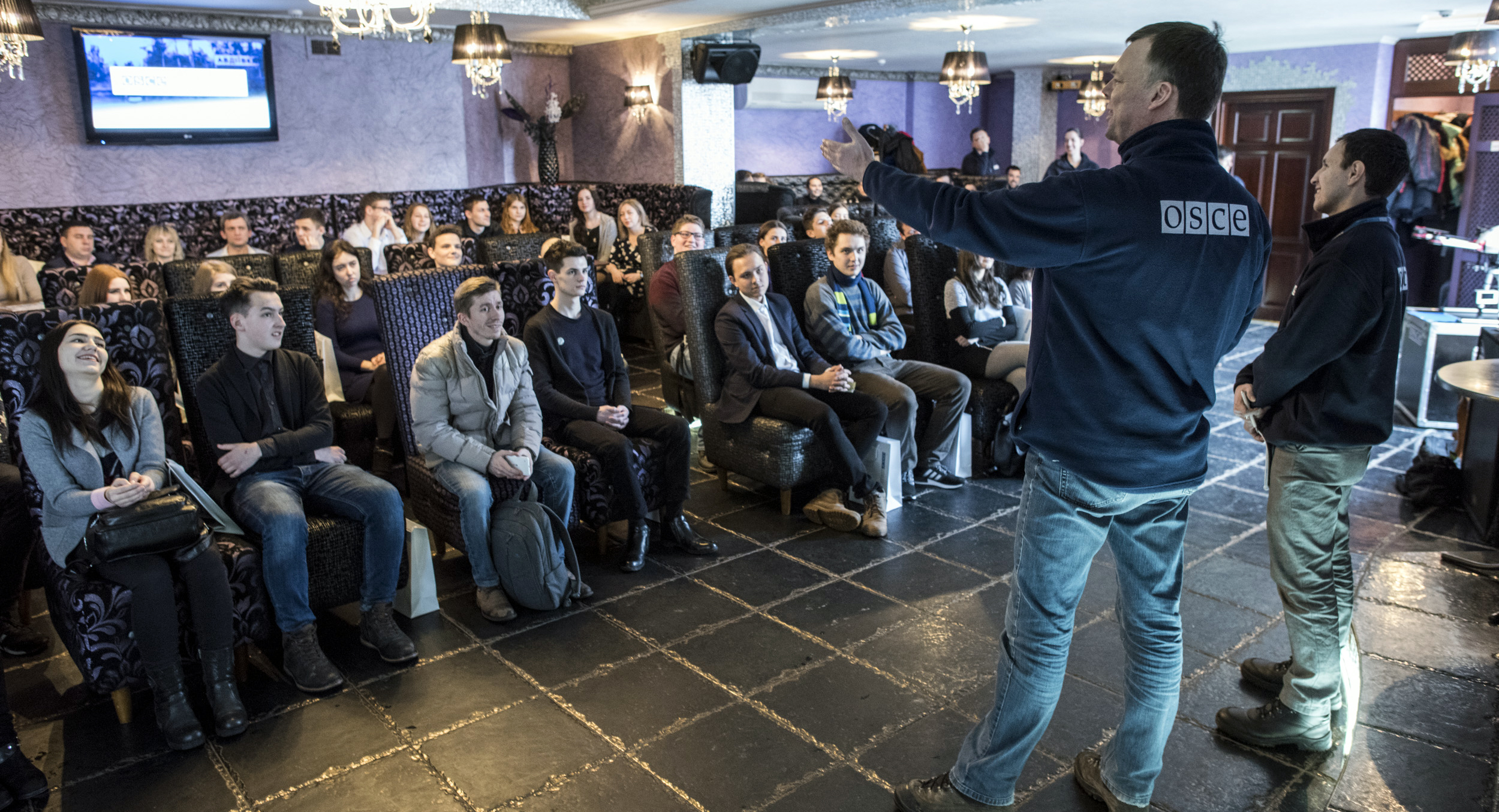 Перший заступник Голови СММ ОБСЄ Александр Хуг спілкується з учасниками ОБСЄ Café у Луганську, 16 лютого 2018 року.