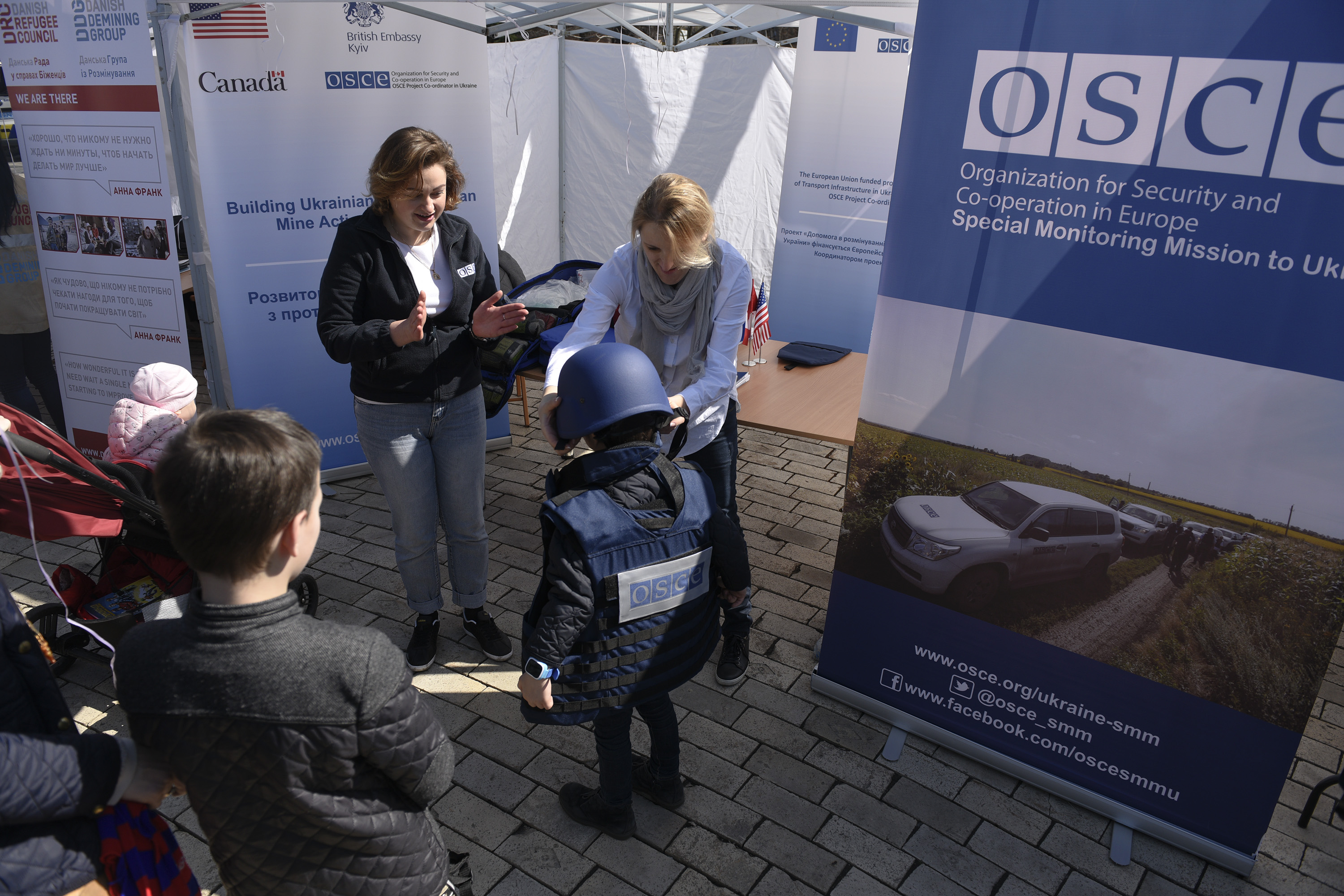 Співробітники Координатора проектів ОБСЄ та Спеціальної моніторингової Місії ОБСЄ в Україні демонструють обладнання для розмінування під час заходів із нагоди Дня просвіти щодо мінної небезпеки; Київ, 4 квітня 2018 року.