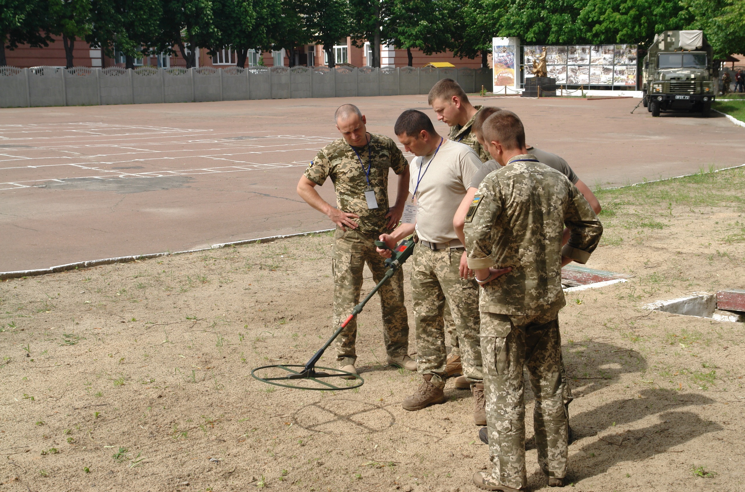 Українські фахівці з Міністерства оборони та Державної служби з надзвичайних ситуацій з використання сучасних металошукачів, наданих Координатором проектів ОБСЄ, у навчальному центрів Державної спеціальної служби транспорту в Чернігові. 28-30 травня 2019 року