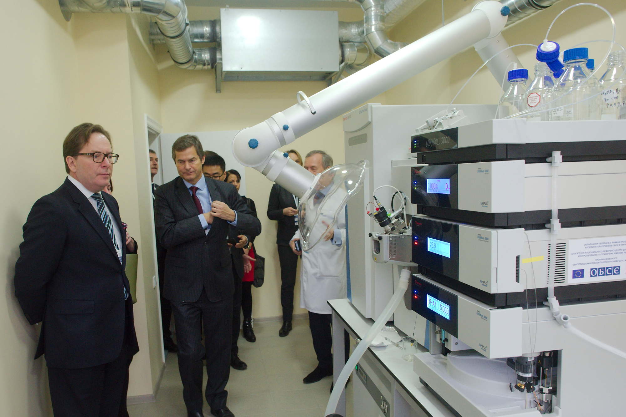 Генрік Вілладсен, Координатор проектів ОБСЄ в Україні (зліва), відвідує лаборатрію Наукового центру превентивної токсикології, харчової та хімічної безпеки імені академіка Л.І. Медведя, щоб переглянути обладнання надане для підсилення здатності Інституту визначати невідомі хімікати. Київ, 10 грудня 2019р.