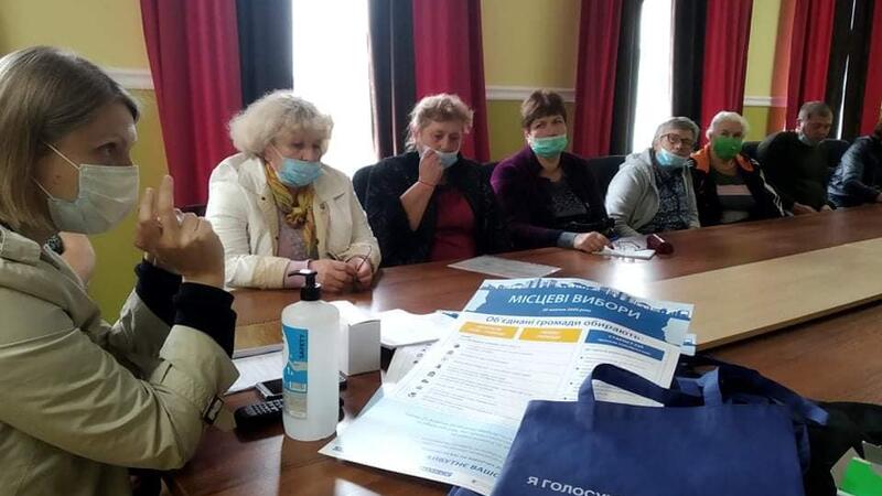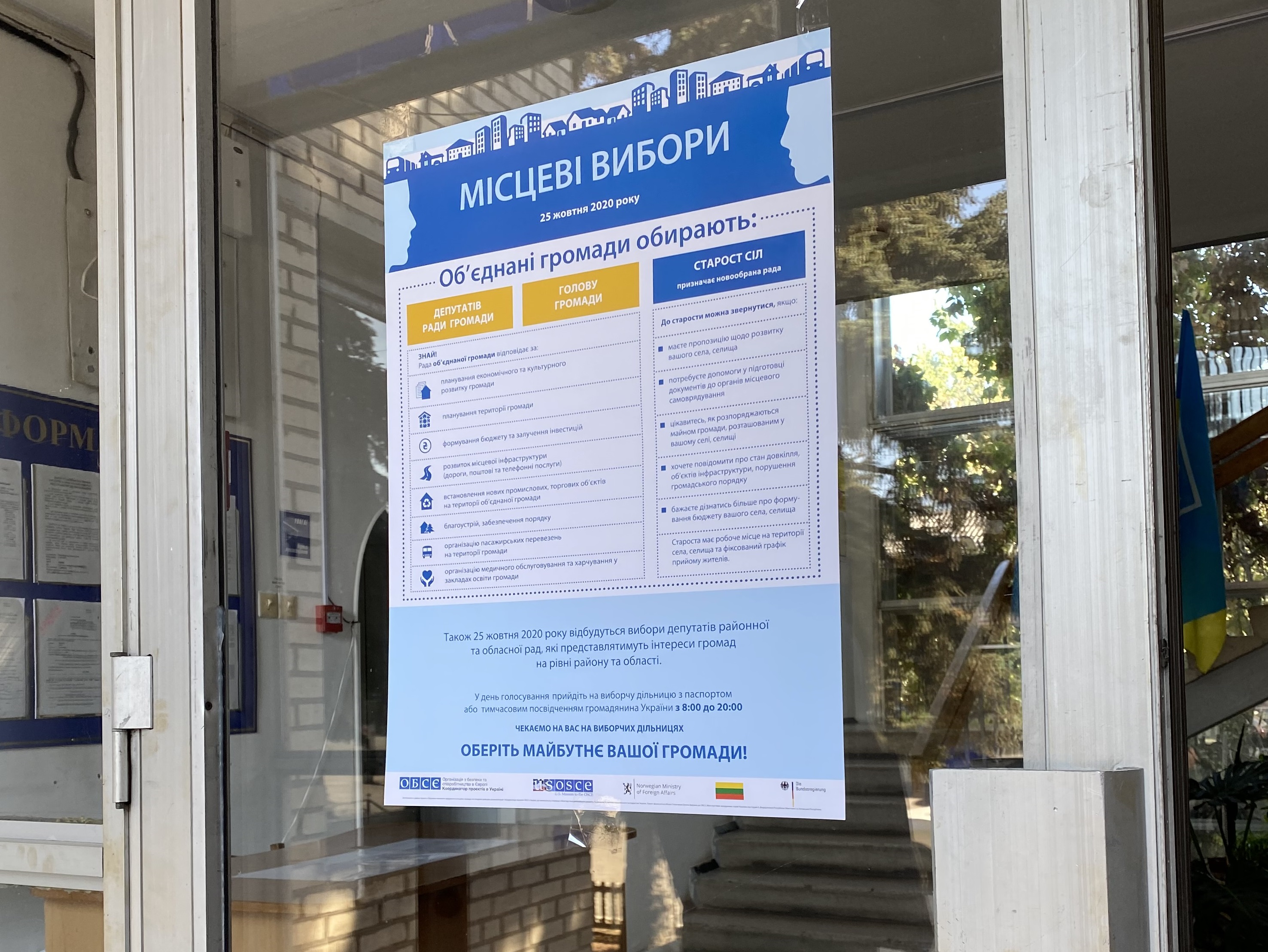 Постер, розроблений за підтримки Координатора проектів ОБСЄ, розміщується на вхідних дверях адміністративної будівлі у Святогірську, Донецька обл. 9 жовтня 2020р.