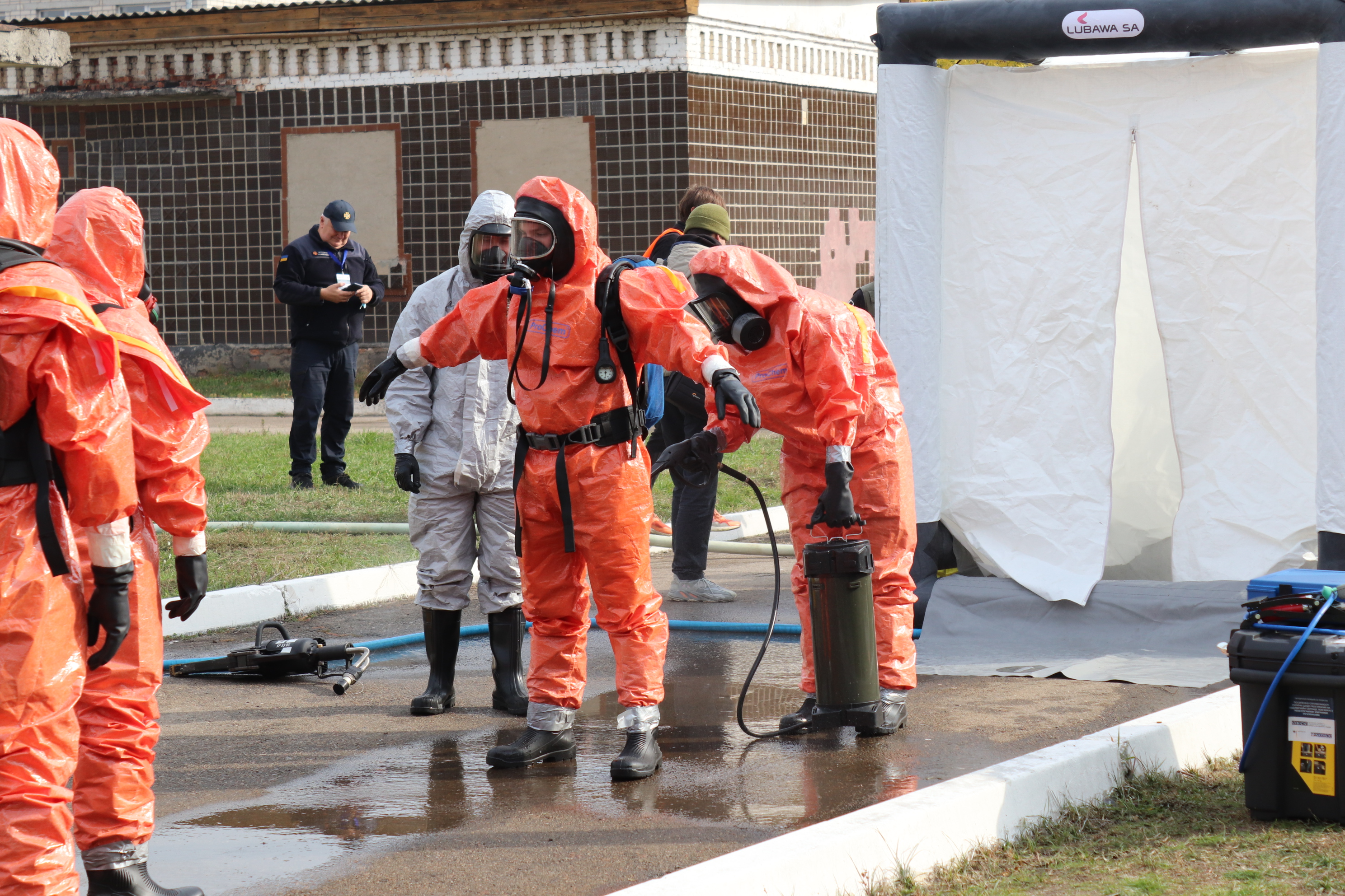 Українскі рятувальники відпрацьовують навички з деконтамінації персоналу у випадку надзвичайнох ситуації з хмінічними речовниами під час практичних вправ, організованих Коорднатором проектів ОБСЄ в Україні. Харків, 13 жовтня 2021 року.