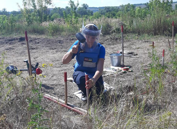 Демінерка шукає небезпечні предмети в полі поблизу Слов'янська, Донецька область, 19 серпня 2020 року.