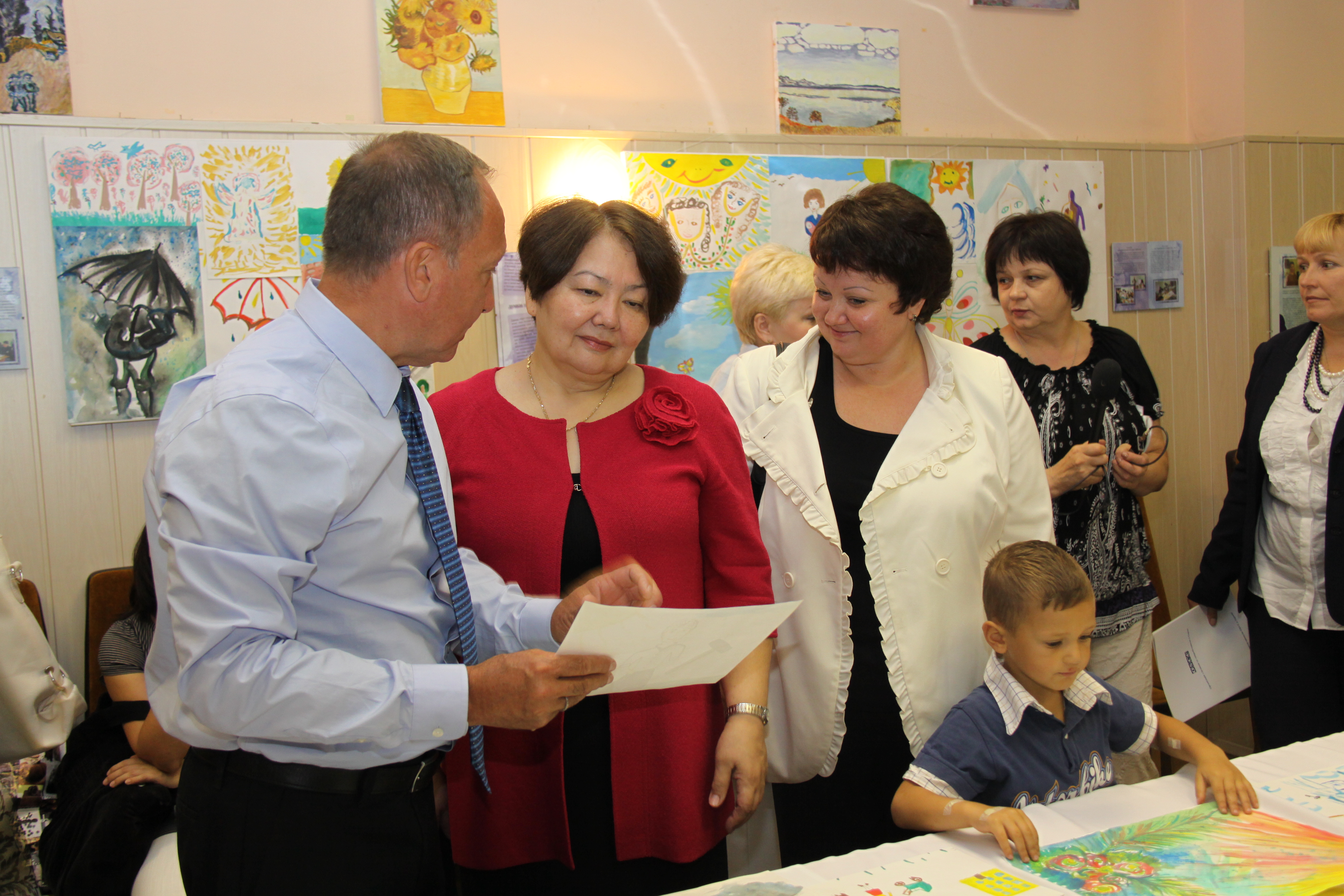 (л-п): Психотерапевт Геннадій Мустафаєв розповідає про арт-терапевтичні методики Координаторові проектів ОБСЄ в Україні послу Мадіні Джарбусиновій та національному менеджеру проектів ОБСЄ Тетяні Руденко після відкриття виставки у Києві, 4 вересня, 2012.