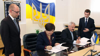 Координатор проектів ОБСЄ в Україні, посол Мадіна Джарбусинова, передала 22 набори спеціалізованого обладнання, включно з моніторами та ноутбуками, Міністерству внутрішніх справ (МВС) України під час церемонії у Києві 25 жовтня 2012 року.