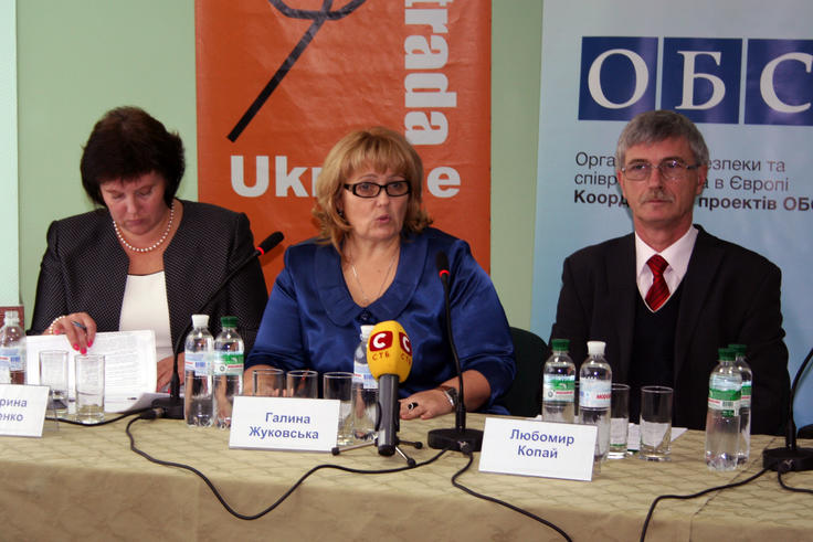(зліва направо) Катерина Левченко, Президент міжнародного жіночого правозахисного центру "Ла Страда Україна", Галина Жуковська, Директор Депертаменту сімейної та гендерної політики Міністерства України у справах сім"ї, молоді і спорту та посол Любомир Копай, Коориднатор проектів ОБСЄ в Україні під час прес-конференції з нагоди Європейського дня протидії торгівлі людьми у Києві, 18 жовтня, 2011 .