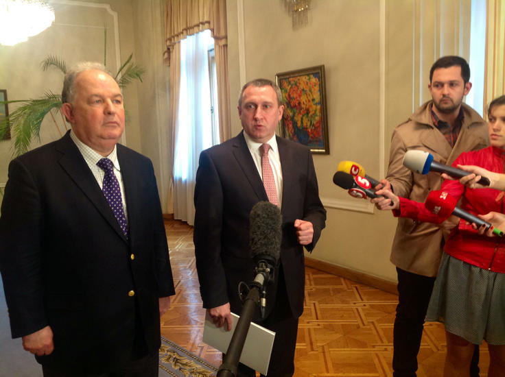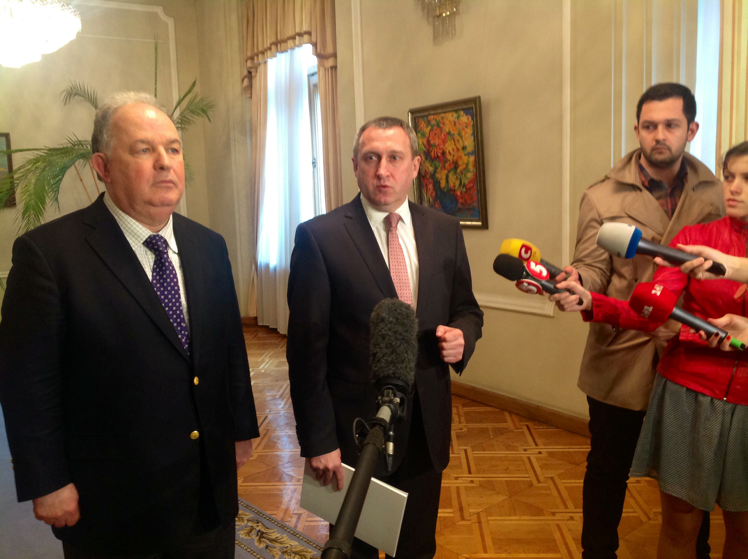 Ukraine Acting Foreign Minister Deshchytsia (R) and OSCE Special Monitoring Mission Chief Apakan speaking to media in Kyiv Monday, 21 April 2014, after a meeting of representatives of the four signatories to the Geneva statement.