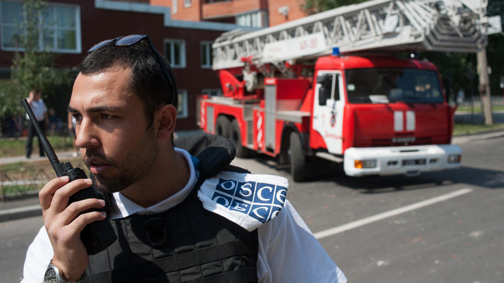 A monitor from the OSCE Special Monitoring Mission to Ukraine, Donetsk, 7 August 2014.